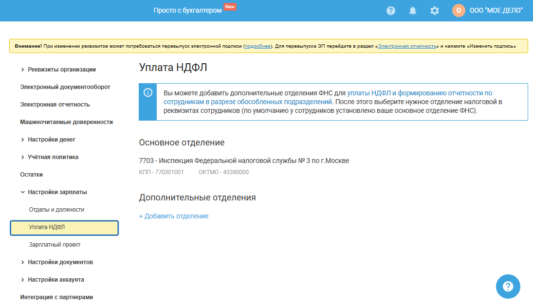 В данном разделе вы можете добавить дополнительные отделения ФНС для уплаты НДФЛ и формирования отчётности по сотрудникам в разрезе обособленных подразделений. После этого выберите нужное отделение налоговой в реквизитах сотрудников (по умолчанию у сотрудников установлено ваше основное отделение ФНС):