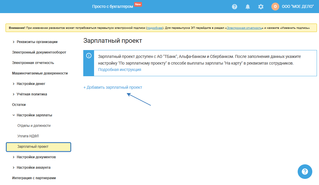 В данном разделе вы можете добавить зарплатный проект. Зарплатный проект доступен с банком Тинькофф, Альфа-банком и Сбербанком: