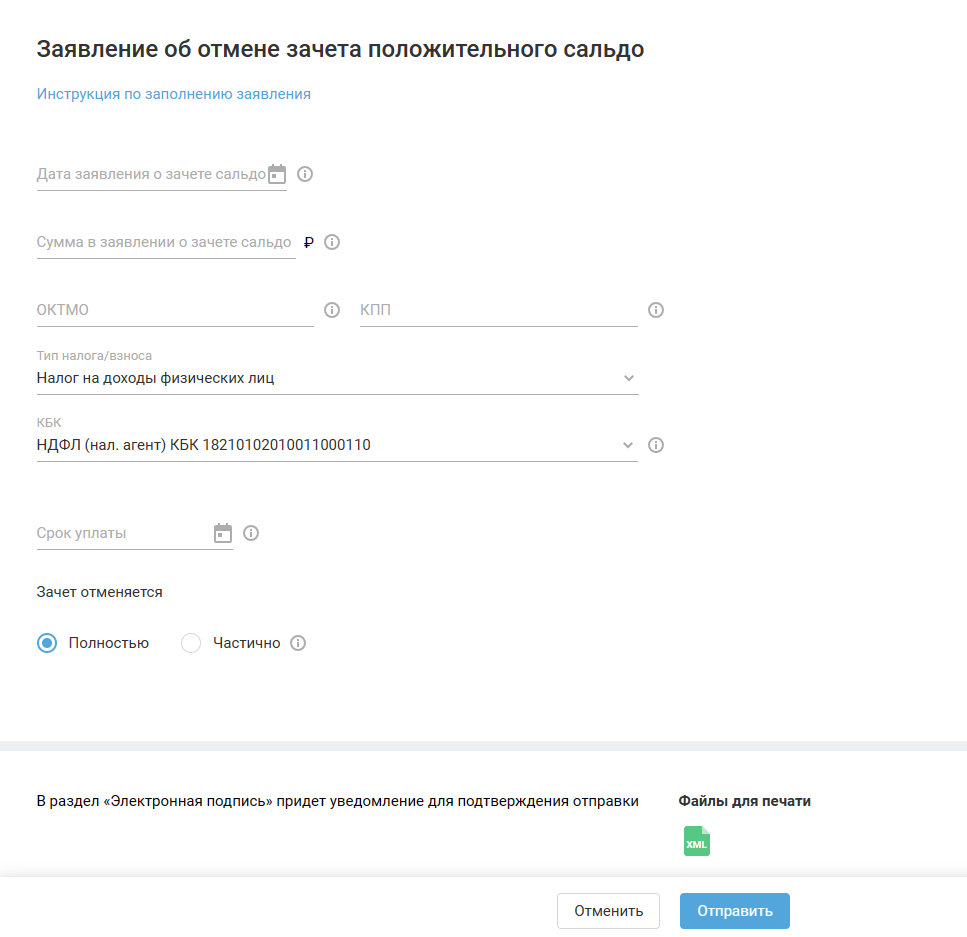 Чтобы заполнить заявление от отмене зачёта положительного сальдо, вначале необходимо указать данные из заявления о зачёте положительного сальдо (т.к. у заявления нет печатной формы, в скобках указано название атрибута в xml формате):