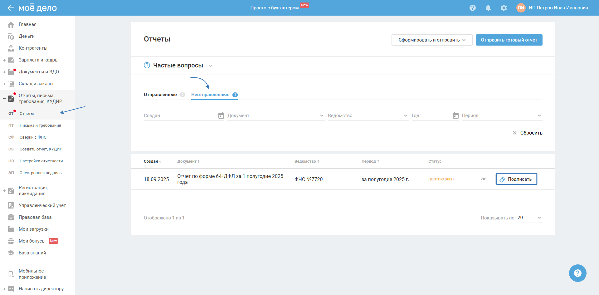 Далее в разделе «Отчёты, письма, требования — Отчёты» во вкладке «Неотправленные» подпишите отправку, чтобы отчёт ушёл в фонд. Для этого напротив отчёта нажмите на кнопку «Подписать»: