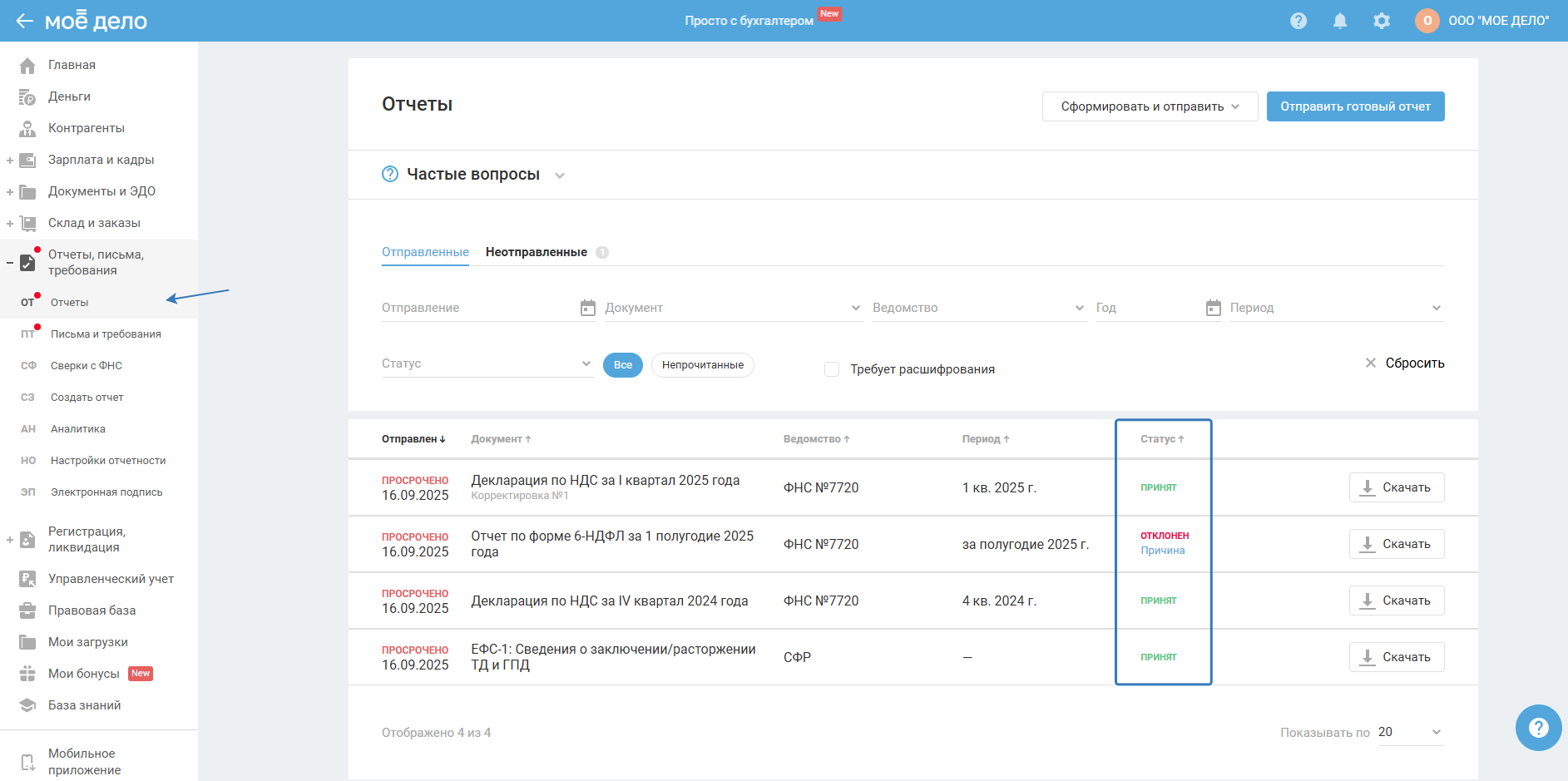 Актуальные статусы отправок и полученные расшифрованные файлы можно посмотреть в разделе «Отчёты, письма, требования — Отчёты» во вкладке «Отправленные»: