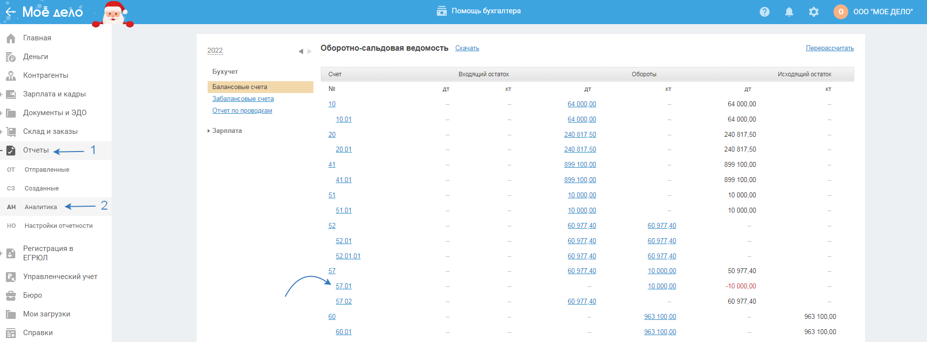 Отрицательный остаток по бух. счету во вкладке Отчеты-Аналитика: