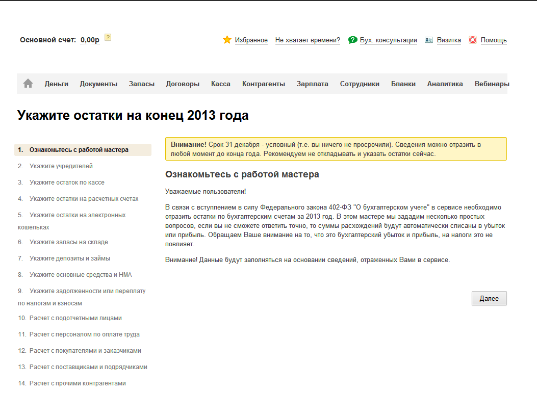В шаге указана информация в каком случае нужно проходить этот мастер. Если учет в сервисе начали вести с отчетногого года, то заполните информацию на каждом шаге при наличие. Это необходимо, чтобы остатки верно отразились в бухгалтерской отчетности за отчетный год по бухгалтерской отчетности.