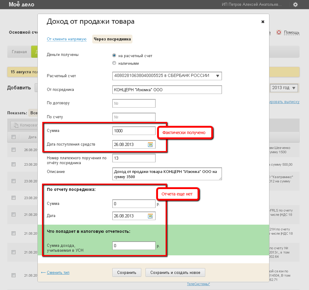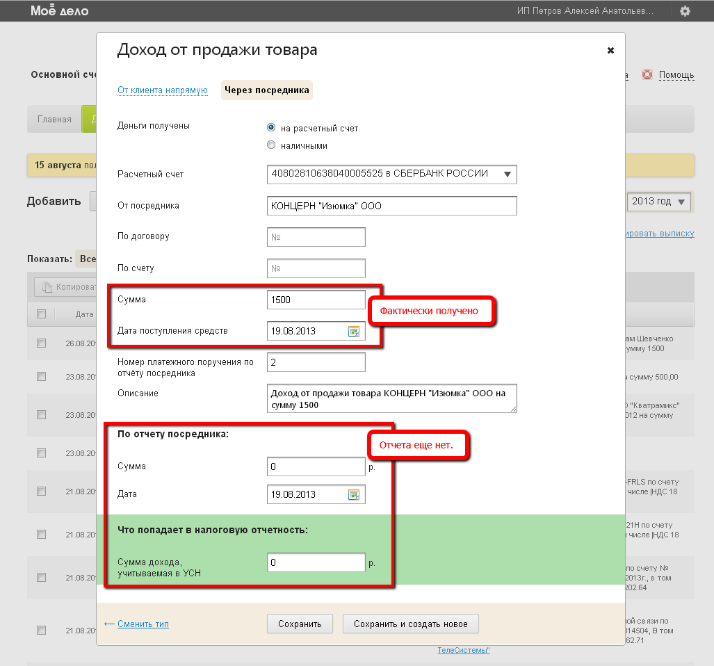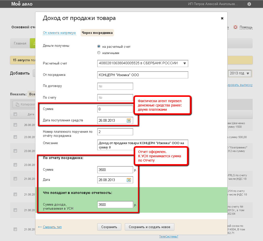 1. Фактические переводы сумм от посредника (после удержания комиссии, отчетов агента нет)