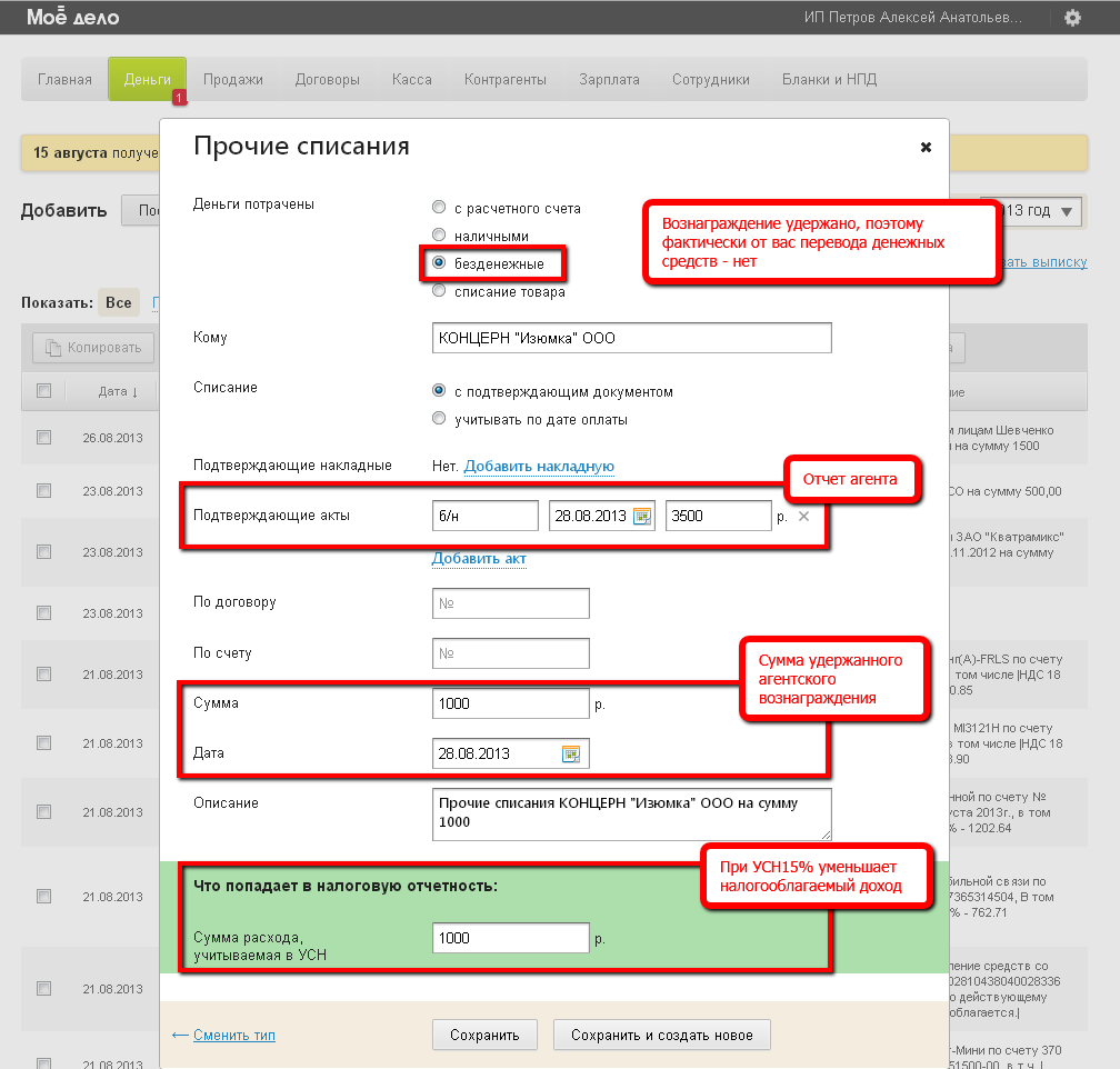 3. Учет Расхода (агентского вознаграждения) в УСН на основании отчета агента (для ООО на УСН 6% и 15%, ИП 15% - обязательно, для ИП 6%-не обязательно).