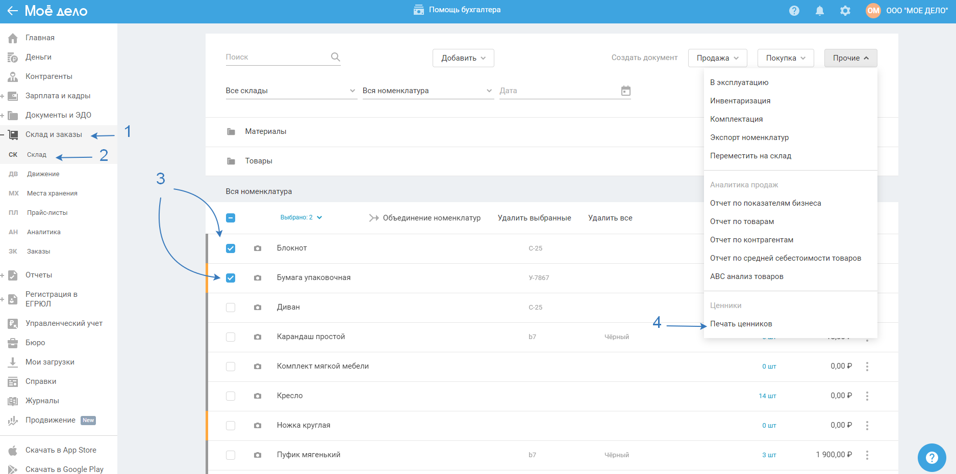 Для того чтобы в сервисе распечатать ценники по имеющийся номенклатуре товаров (материалов), перейдите в раздел Склад и заказы — Склад, укажите названия товаров, по которым необходимо подготовить ценники, нажмите на кнопку «Прочее» в правом верхнем углу и выберите из списка опцию «Печать ценников»: