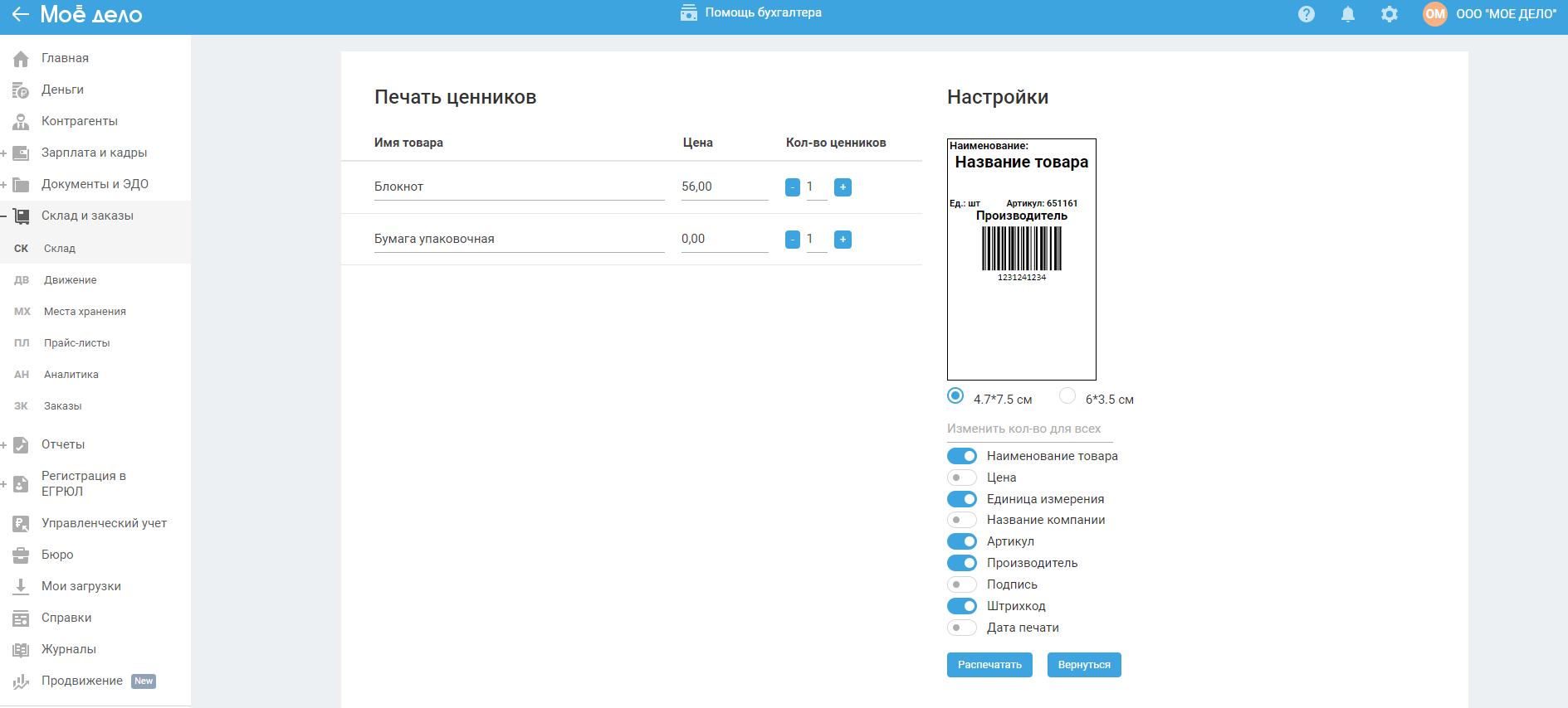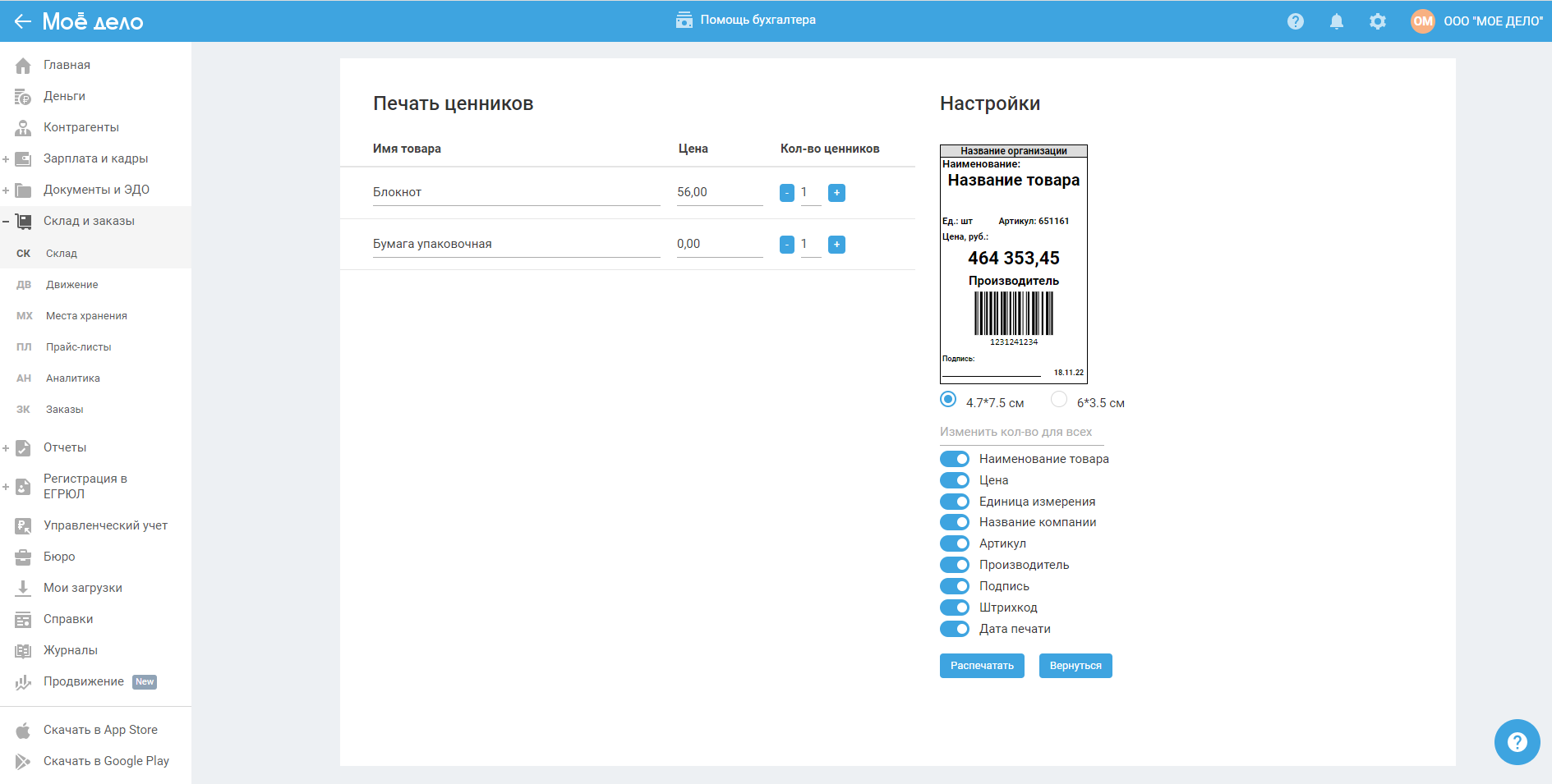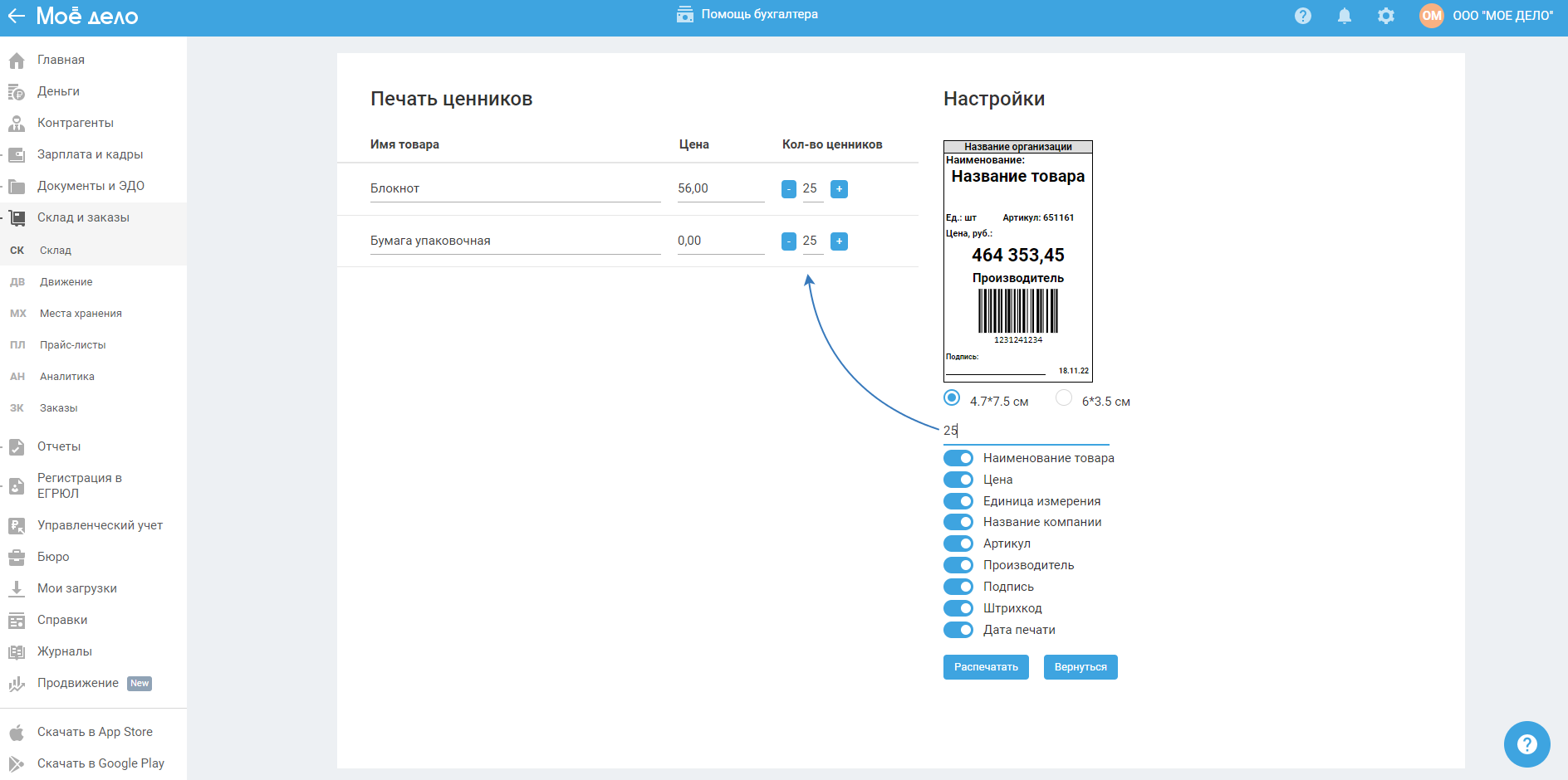 - количество ценников — задаётся по умолчанию один, можете увеличивать/уменьшать с помощью кнопок «+ / -» или сразу задать одинаковое количество для всех позиций в блоке с настройками.