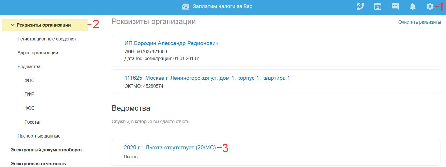 Перейдите в раздел «Реквизиты» (шестеренка в правом верхнем углу экрана) и выберите пункт "Льготы".