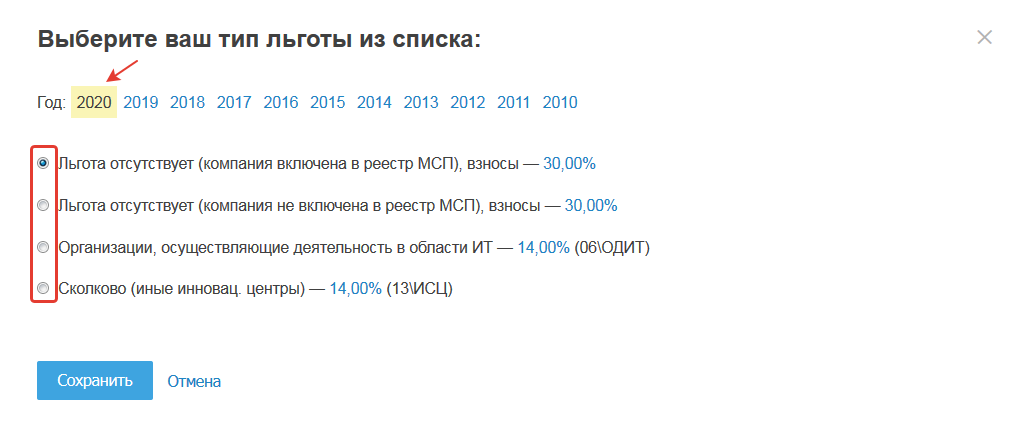 В открывшемся окне выберите применяемый тип льготы. При необходимости укажите год.