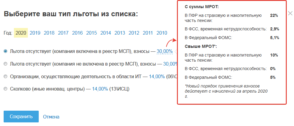 При определенных условиях (ст. 427 Налогового кодекса РФ) работодатели имеют право на применение льгот по взносам за сотрудников в ПФР, ФОМС, ФСС. Чтобы отразить их в сервисе, нужно сделать следующее.