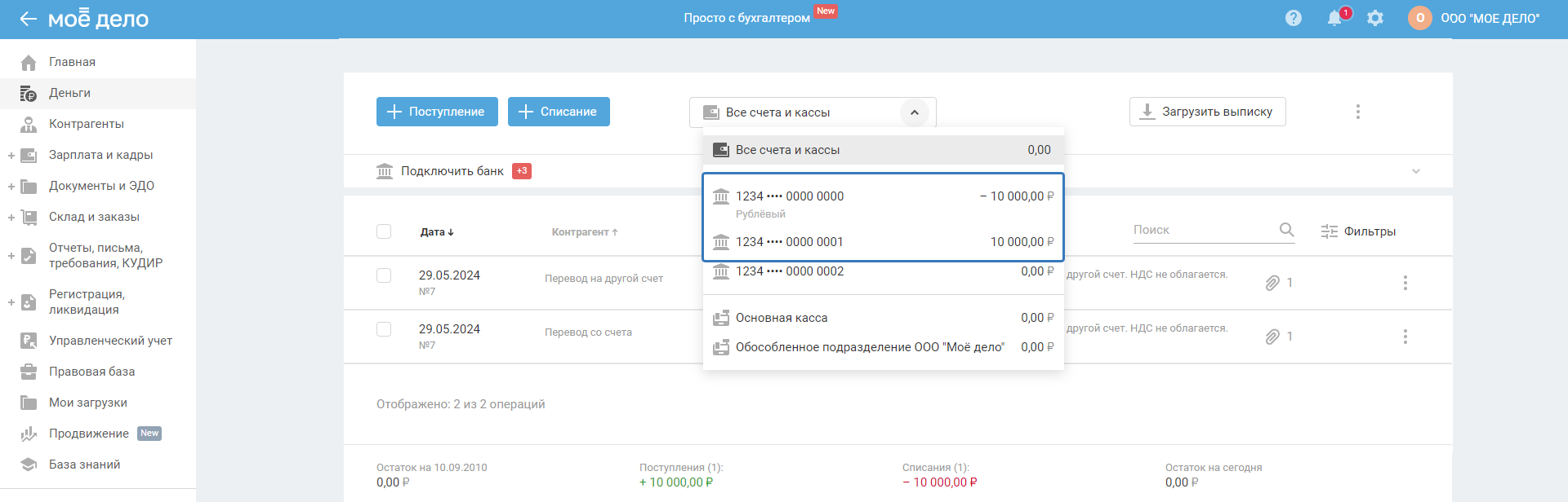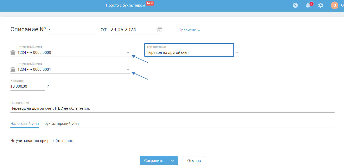 В этом случае в разделе «Деньги» будет создана одна операция списания, но при этом движение денежных средств пройдёт по обоим счетам — с которого списались и на который зачислились. Например, на расчётный счёт *0001 поступило 10 000 руб. со счёта *0000, тогда создайте списание с типом «Перевод на другой счёт» со счёта*0000 на счёт *0001. После заполнения всех обязательных полей нажмите на кнопку «Сохранить».