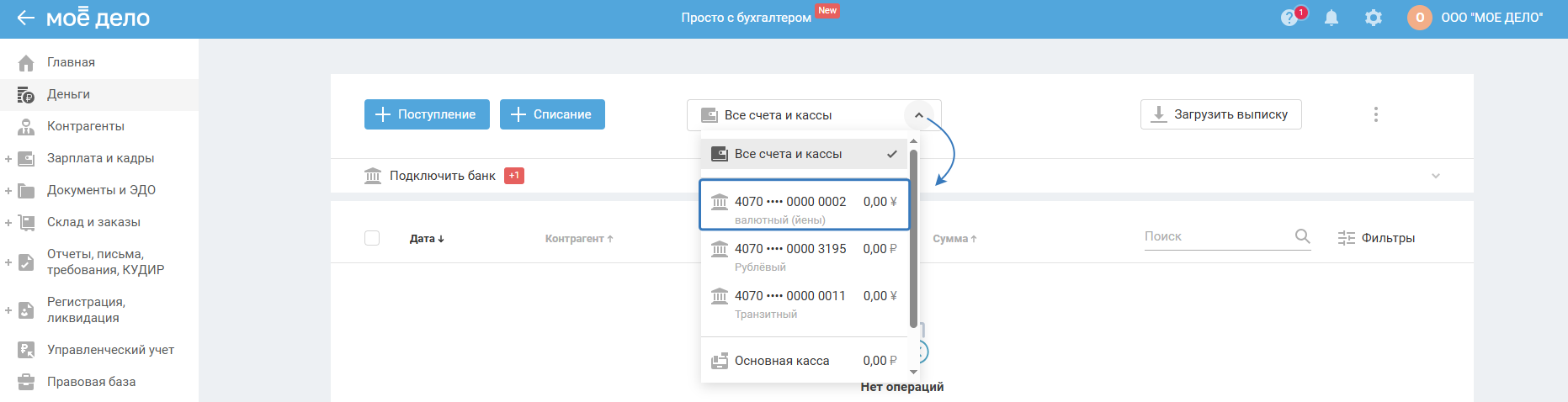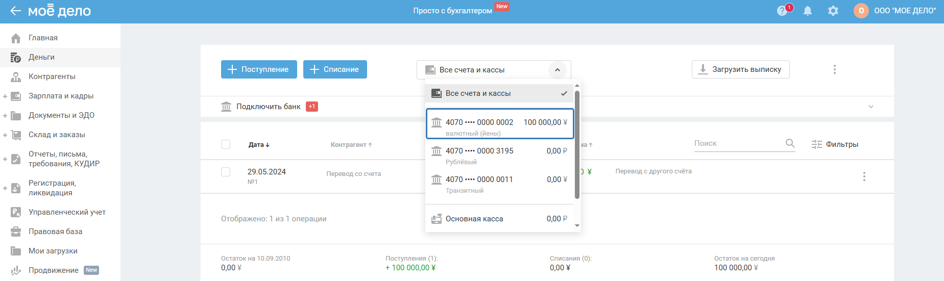 В разделе «Деньги» нажмите на поле «Все счета и кассы» и выберите из выпадающего валютный расчётный или транзитный счёт, на который поступили денежные средства от перевода валюты: