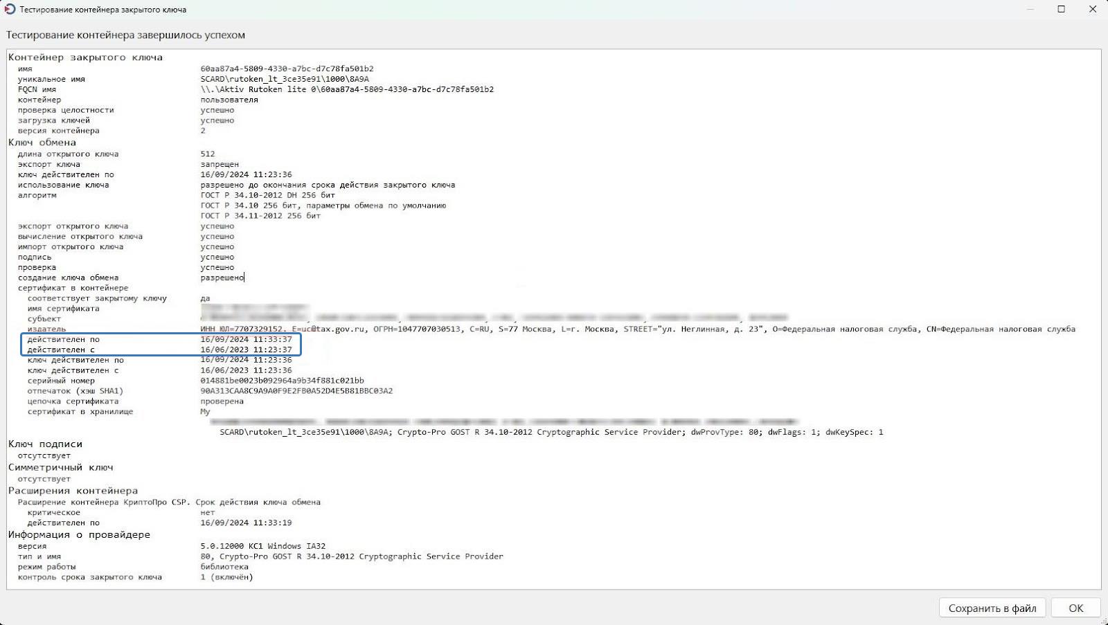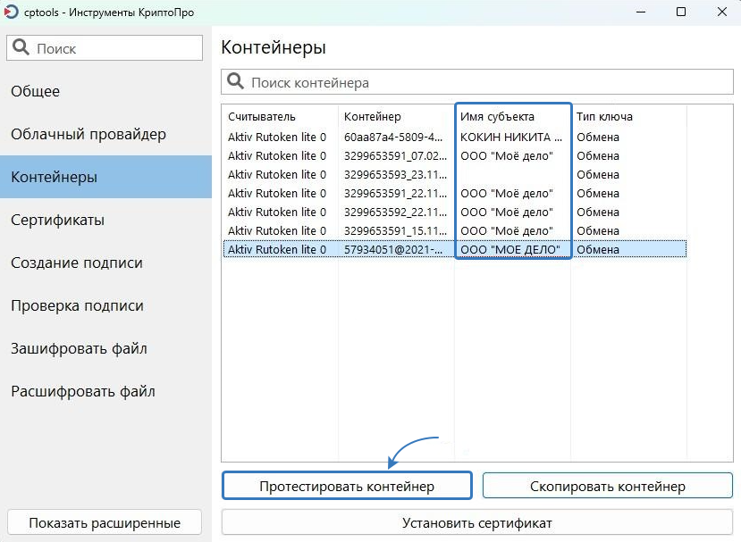 Важно. Если для перевыпуска электронной подписи или записи новой электронной подписи использован тот же токен (USB-носитель), контейнеров с нужным именем субъекта будет несколько. В этом случае нажмите на кнопку «Протестировать контейнер»: