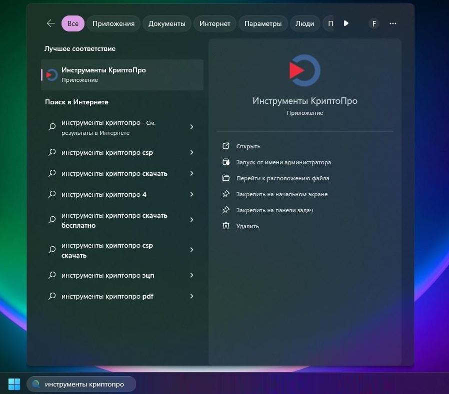 Если у вас Windows, то нажмите на «Пуск» — «Поиск», наберите «Инструменты КриптоПро» и нажмите «Открыть»: