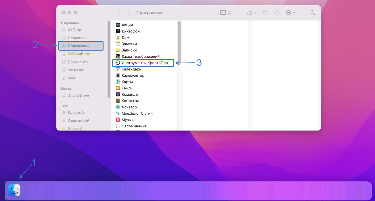 Если у вас MacOS, то нажмите на иконку «Finder» и перейдите в раздел «Программы», в списке программ найдите иконку программы «Инструменты КриптоПро» и запустите: