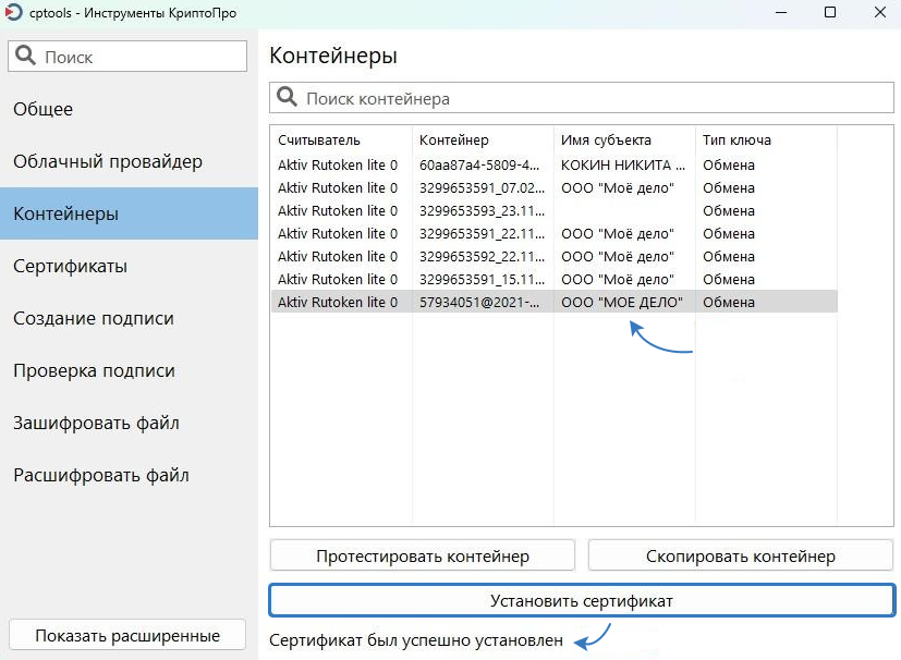 В программе «Инструменты КриптоПро» перейдите в раздел «Контейнеры», выберите контейнер с актуальной электронной подписью (обратите внимание на третий столбец «Имя субъекта») и нажмите на кнопку «Установить сертификат». Через некоторое время появится сообщение «Сертификат был успешно установлен»: