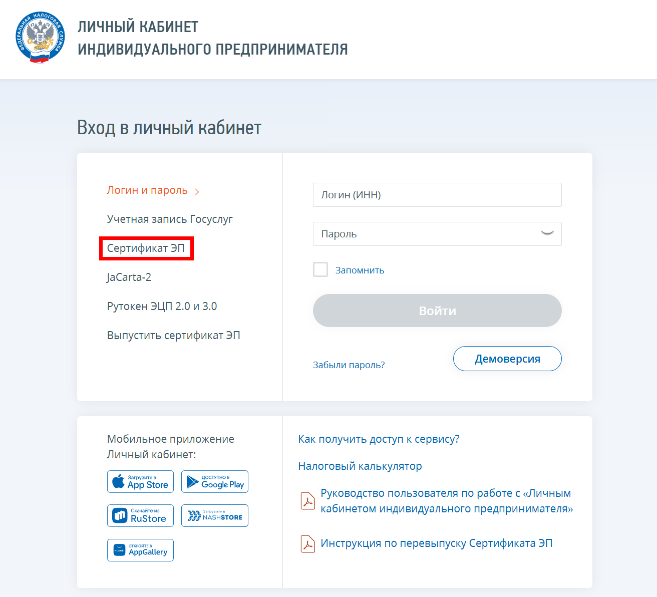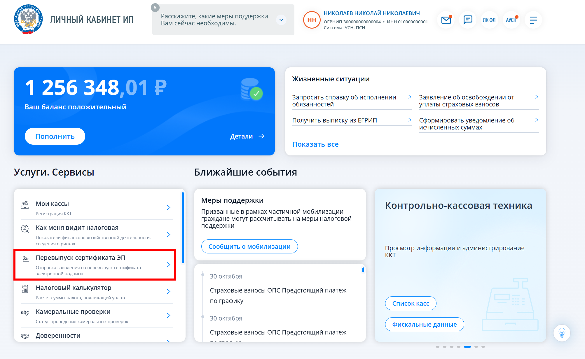 - в личном кабинете ИП: «Услуги.Сервисы» — «Перевыпуск сертификата ЭП».