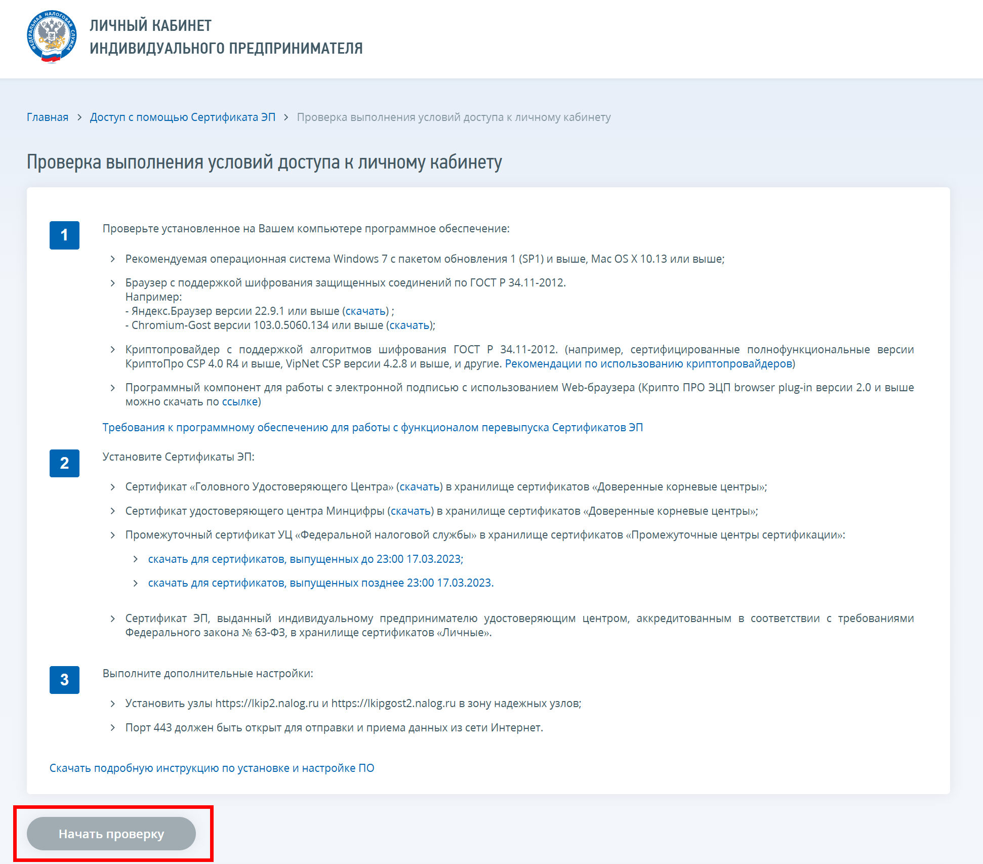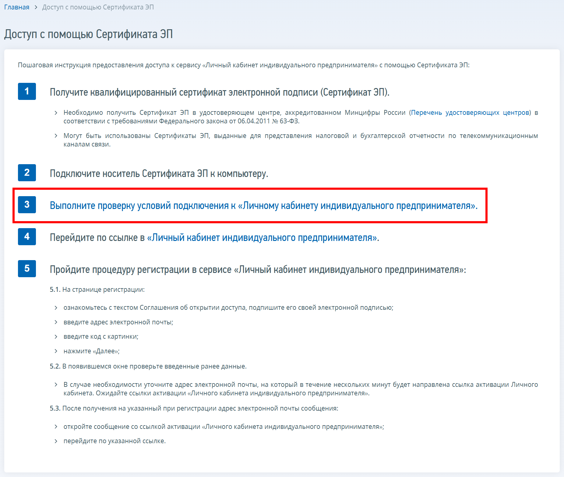 - Проверьте, настроен ли ваш комьпьютер верно для работы с КЭП, нажав на ссылку «Выполните проверку условий подключения к личному кабинету индивидуального предпринимателя»