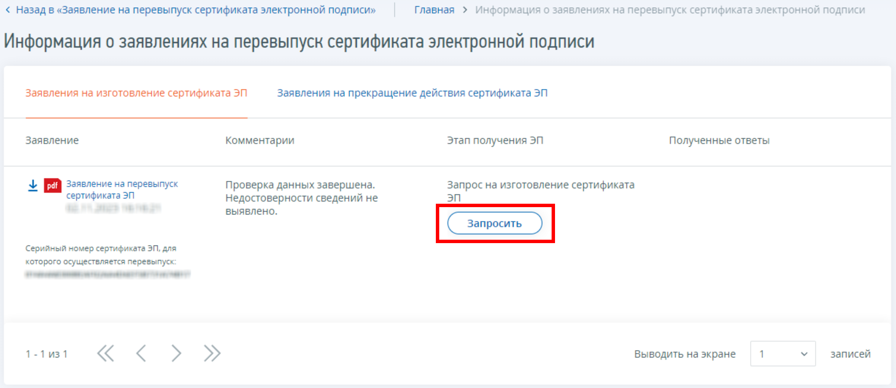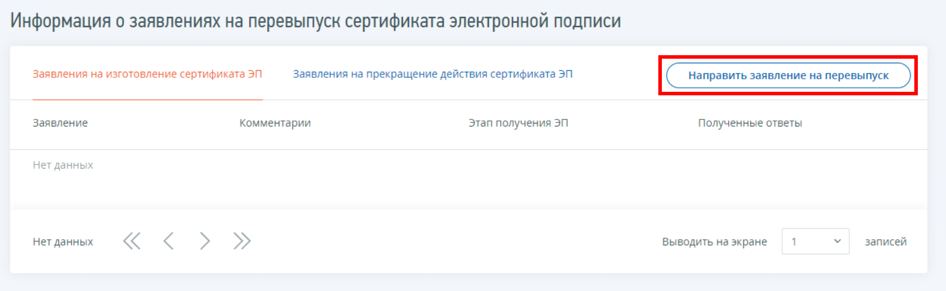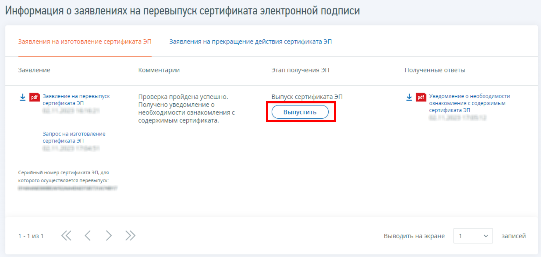 - После обработки запроса, вернитесь в раздел «Информация о заявлениях на перевыпуск сертификата электронной подписи» и нажмите «Выпустить»