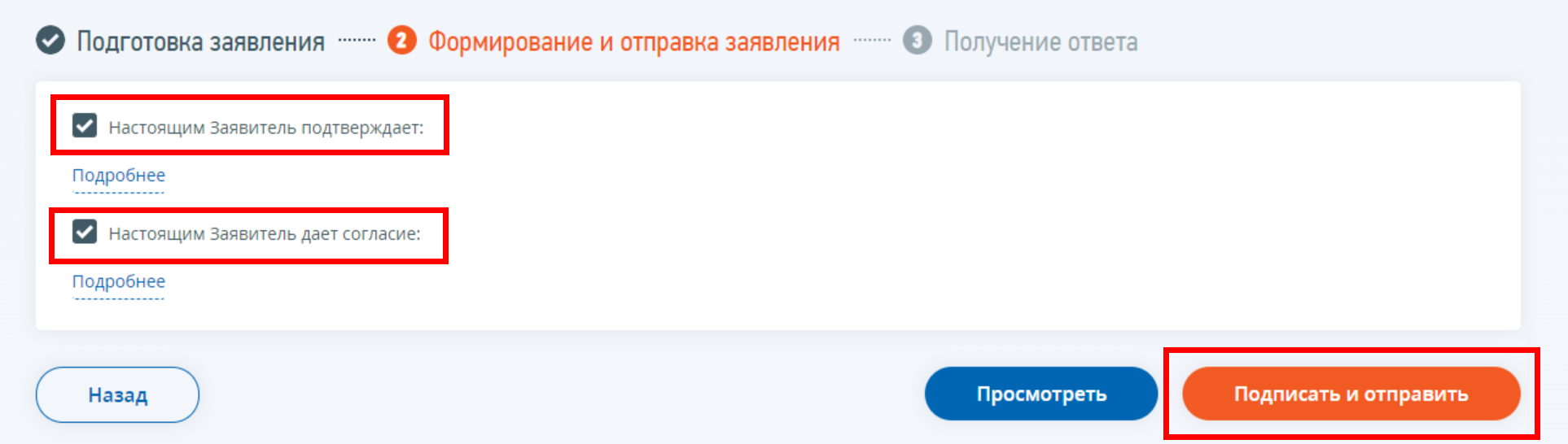 - Поставьте галочки в окнах «Настоящим Заявитель подтверждает» и «Настоящим Заявитель даёт согласие», а затем нажмите «Подписать и отправить»