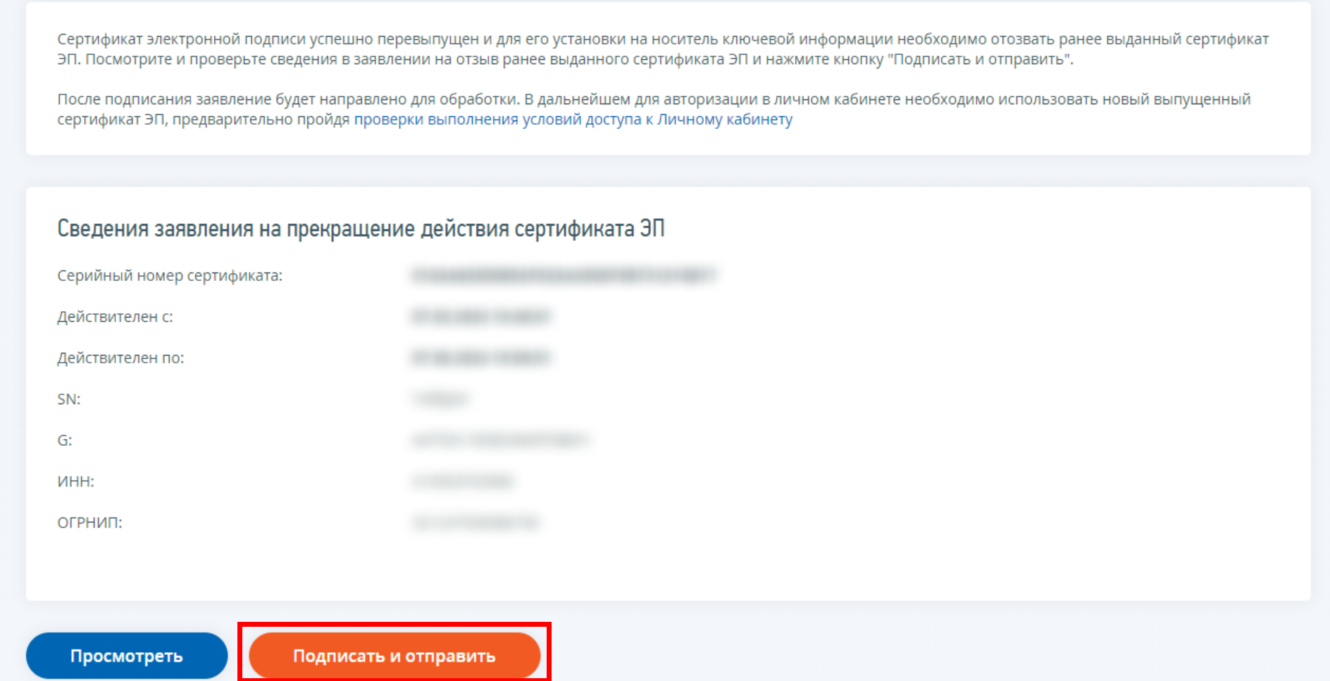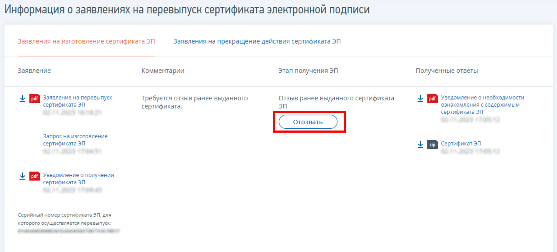 - Так как у руководителя организации и ИП может быть только один сертификат ЭП ФНС, потребуется отозвать действующий сертификат. Для этого вернитесь в раздел «Информация о заявлениях на перевыпуск сертификата электронной подписи». Подпишите заявление на отзыв действующего сертификата