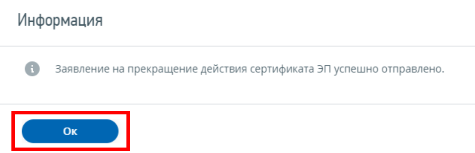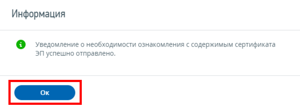 - После успешной отправки уведомления нажмите «Ок», чтобы вернуться на страницу информации о продлении подписи