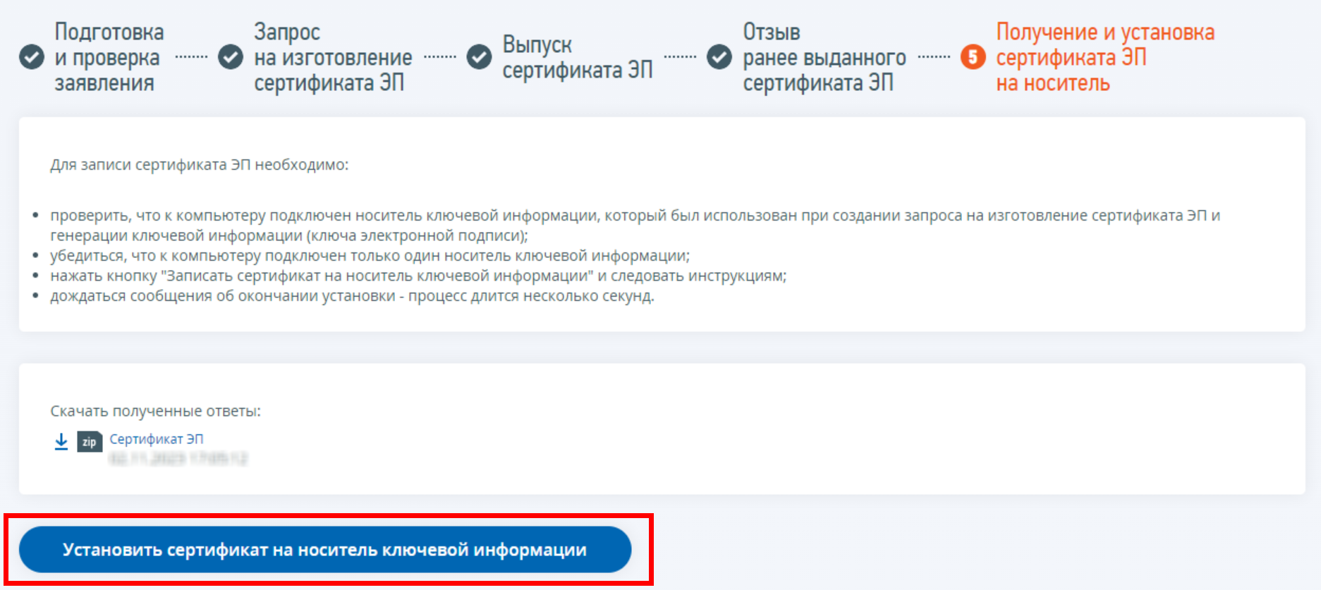 - Убедитесь, что usb-токен с действующим сертификатом подключен к компьютеру и нажмите «Установить сертификат на носитель ключевой информации».