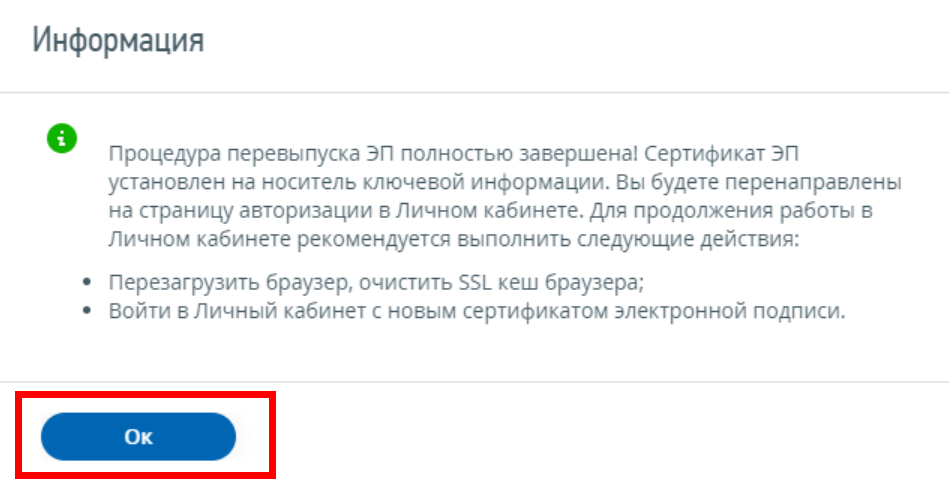 - В появившемся окне об успешной отправке заявления нажмите «Ок», после чего вы будете возвращены на страницу перевыпуска ЭП