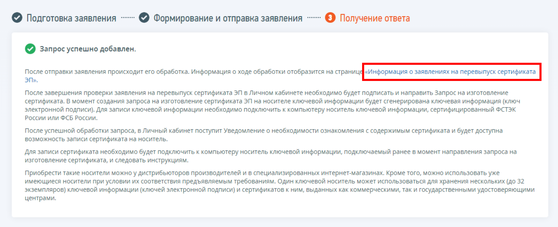 - В появившемся окне с успешным добавлением запроса нажмите на ссылку «Информация о заявлениях на перевыпуск сертификата ЭП».