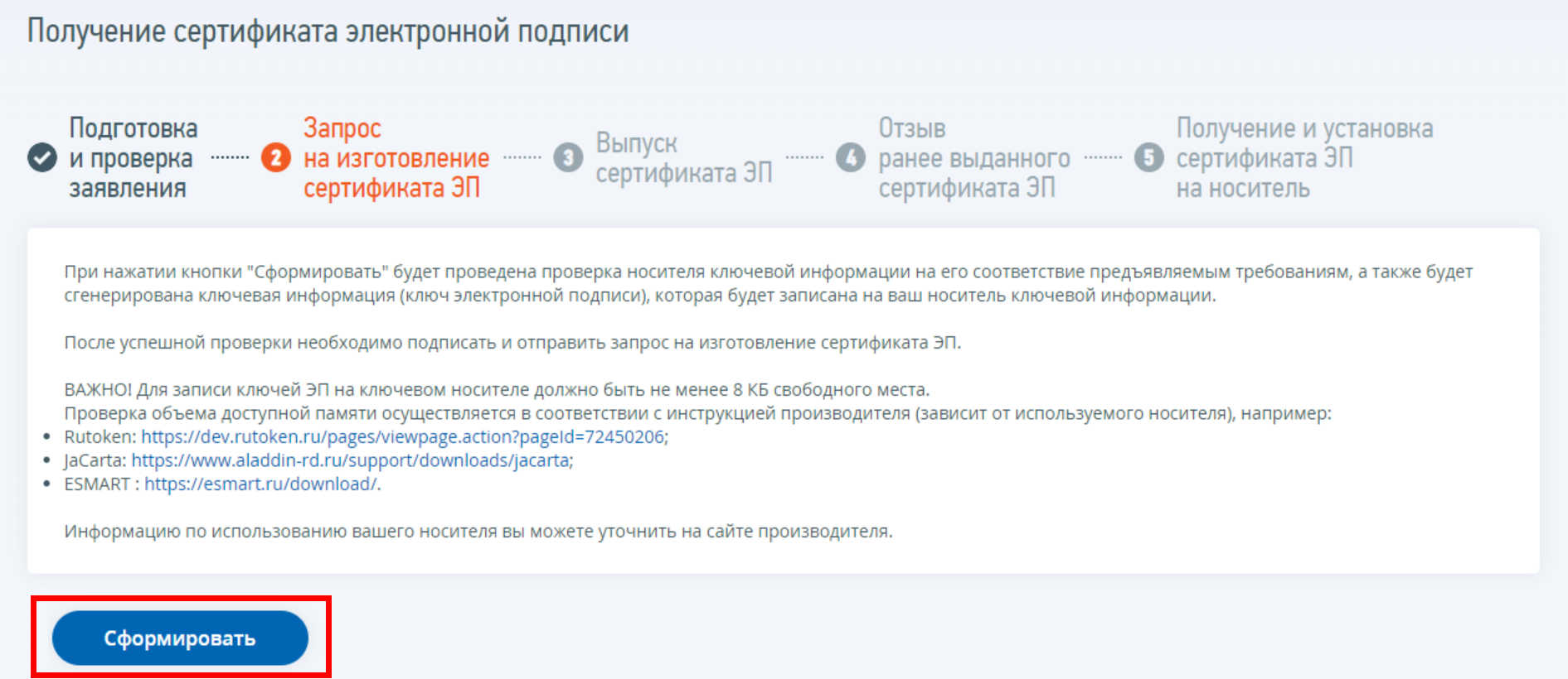 - На открывшейся странице «Получение сертификата электронной подписи» нажмите «Сформировать»