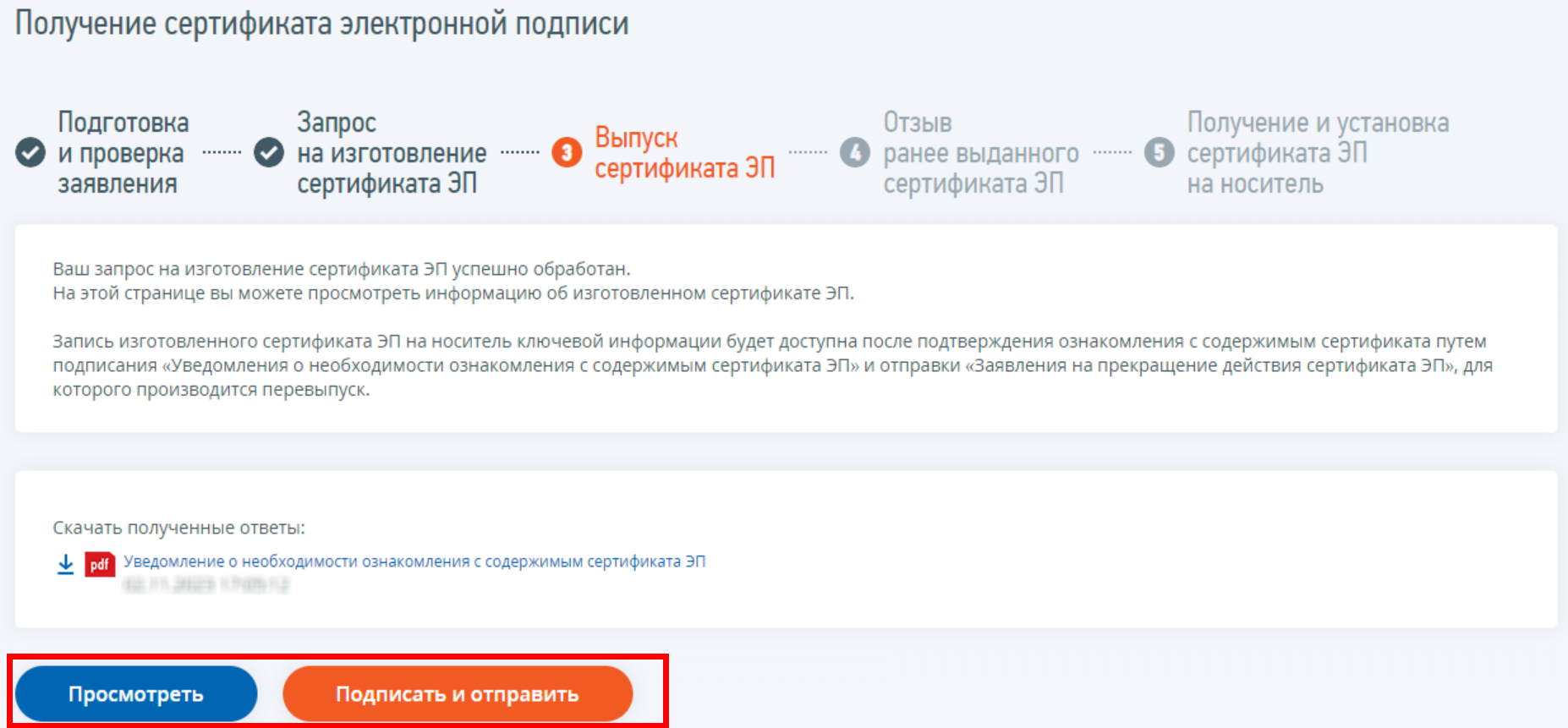- Откроется шаг «Выпуск сертификата ЭП»: ознакомьтесь со сформированным уведомлением, нажав на кнопку «Просмотреть», а затем нажмите «Подписать и отправить».
