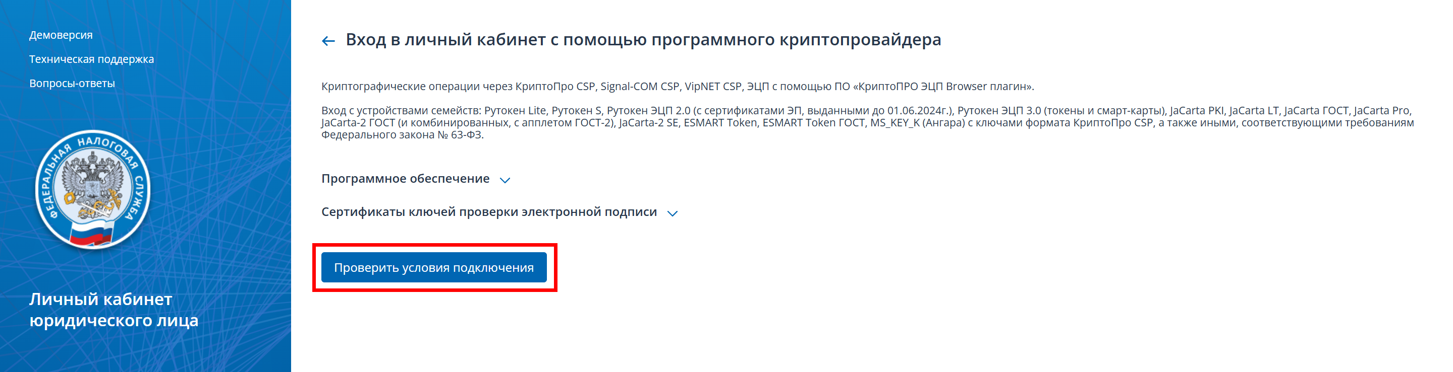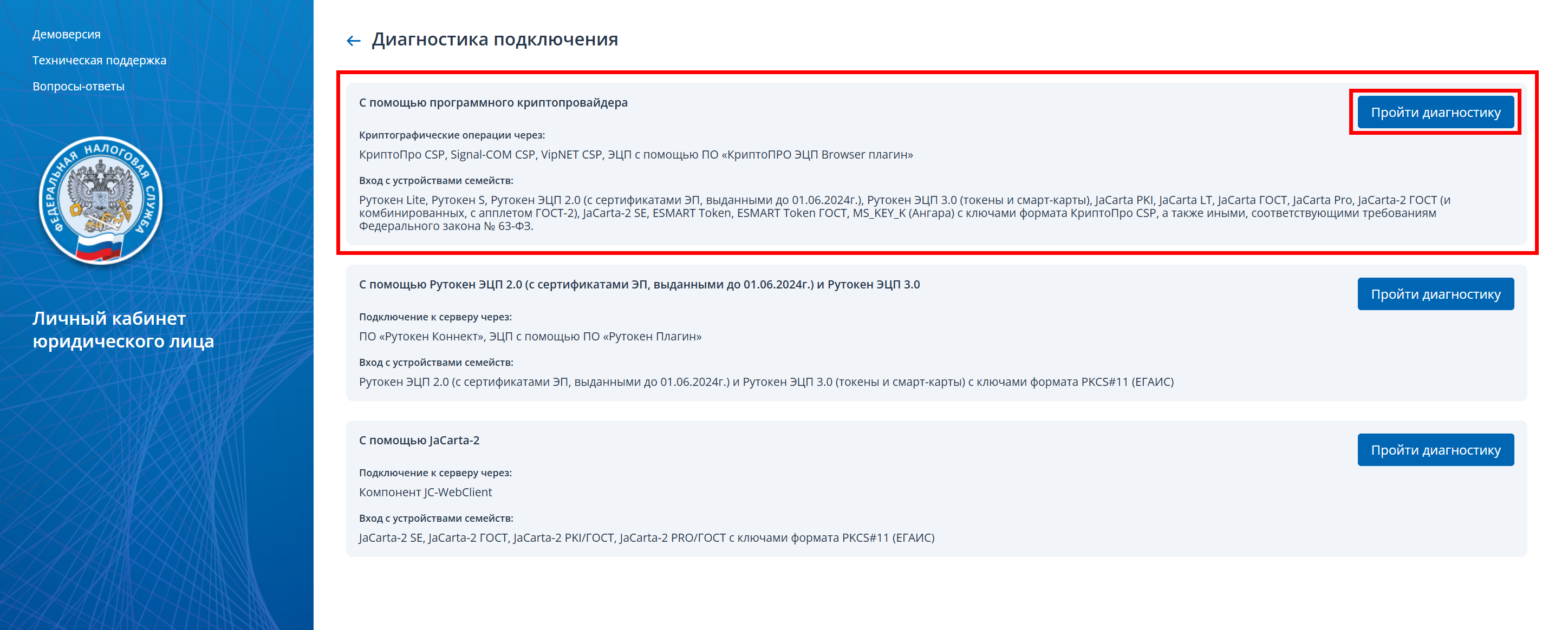- Нажмите «Пройти диагностику» в блоке «С помощью программного криптопровайдера»