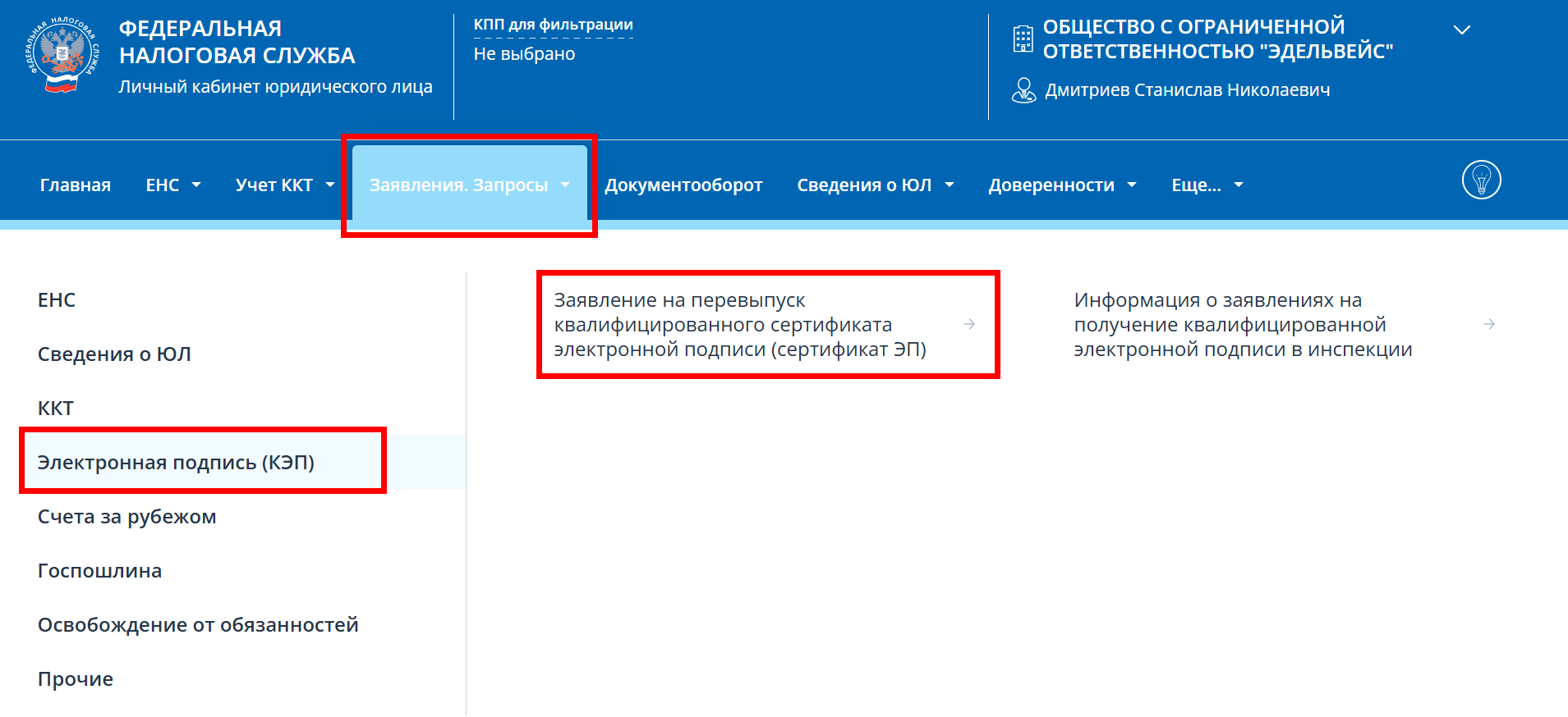 - в личном кабинете ЮЛ: «Заявления.Запросы» — «Электронная подпись (КЭП)»;