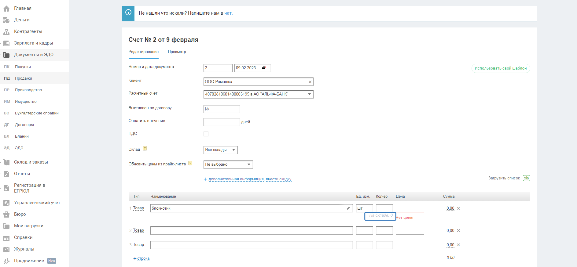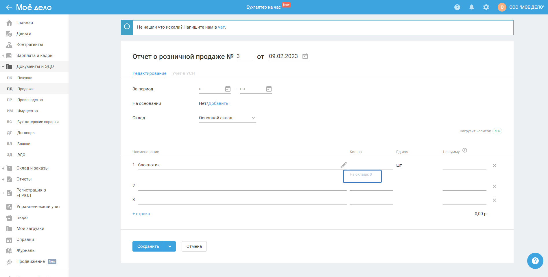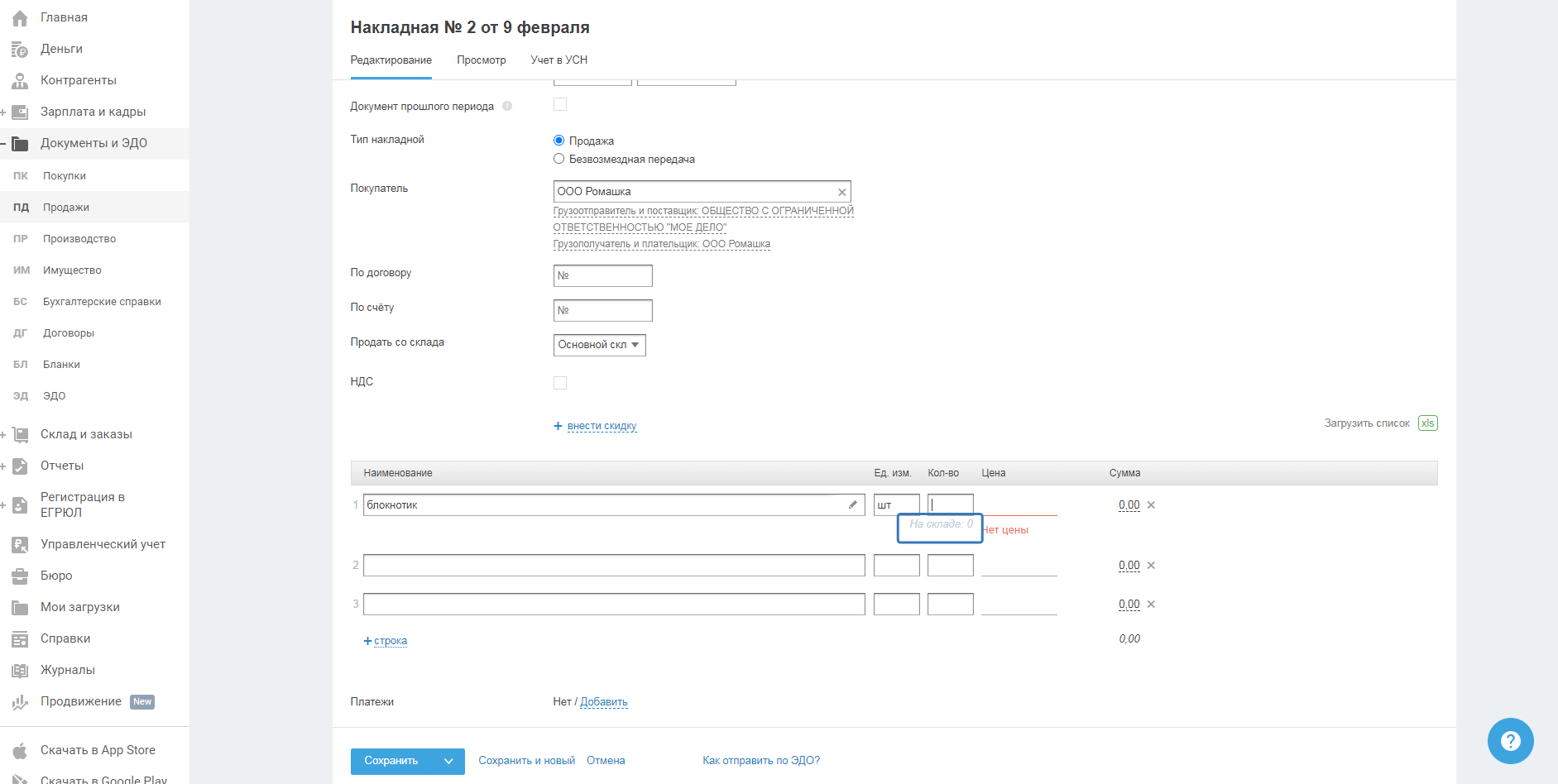 При создании и редактировании документов на продажу таких как: счёт на оплату(счёт-договор); накладная на продажу(накладная на возврат); отчёт о розничной продаже; УПД на продажу - после ввода наименования товара, под полем с количеством товара появляется информация о наличии остатков на складе по каждой позиции (номенклатуре).