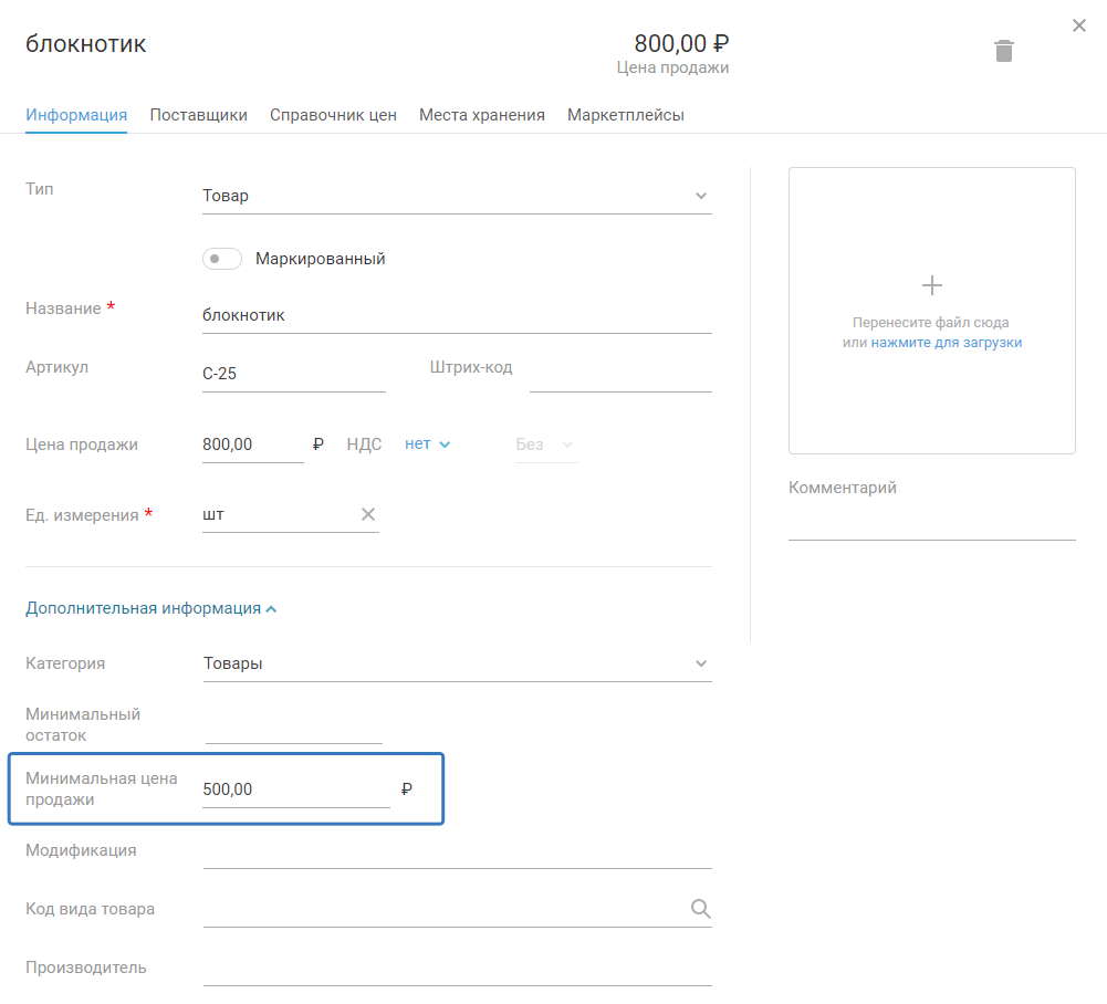 При создании документа на продажу, данные в графу "Цена" попадают автоматически из карточки товара. Подсказка по минимальной продажной цене также автоматически проставляется в документе на продажу по данным, указанным в карте товара, в блоке с дополнительной информацией, в строке "минимальная цена продажи"