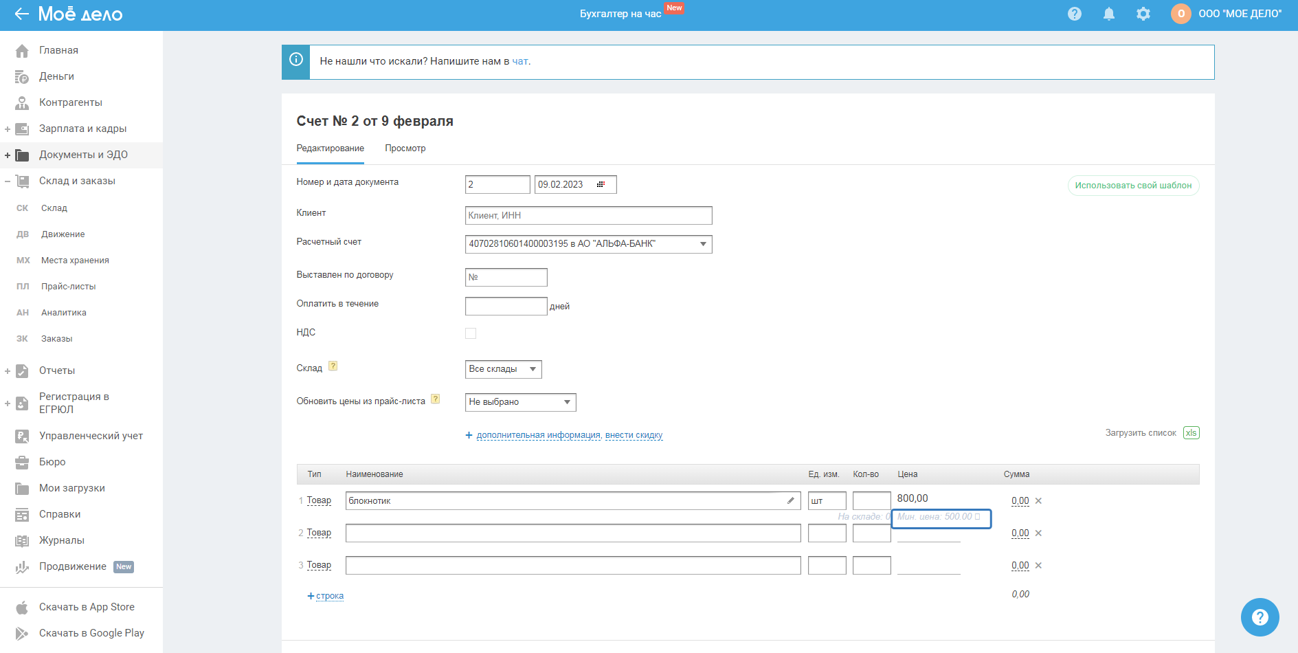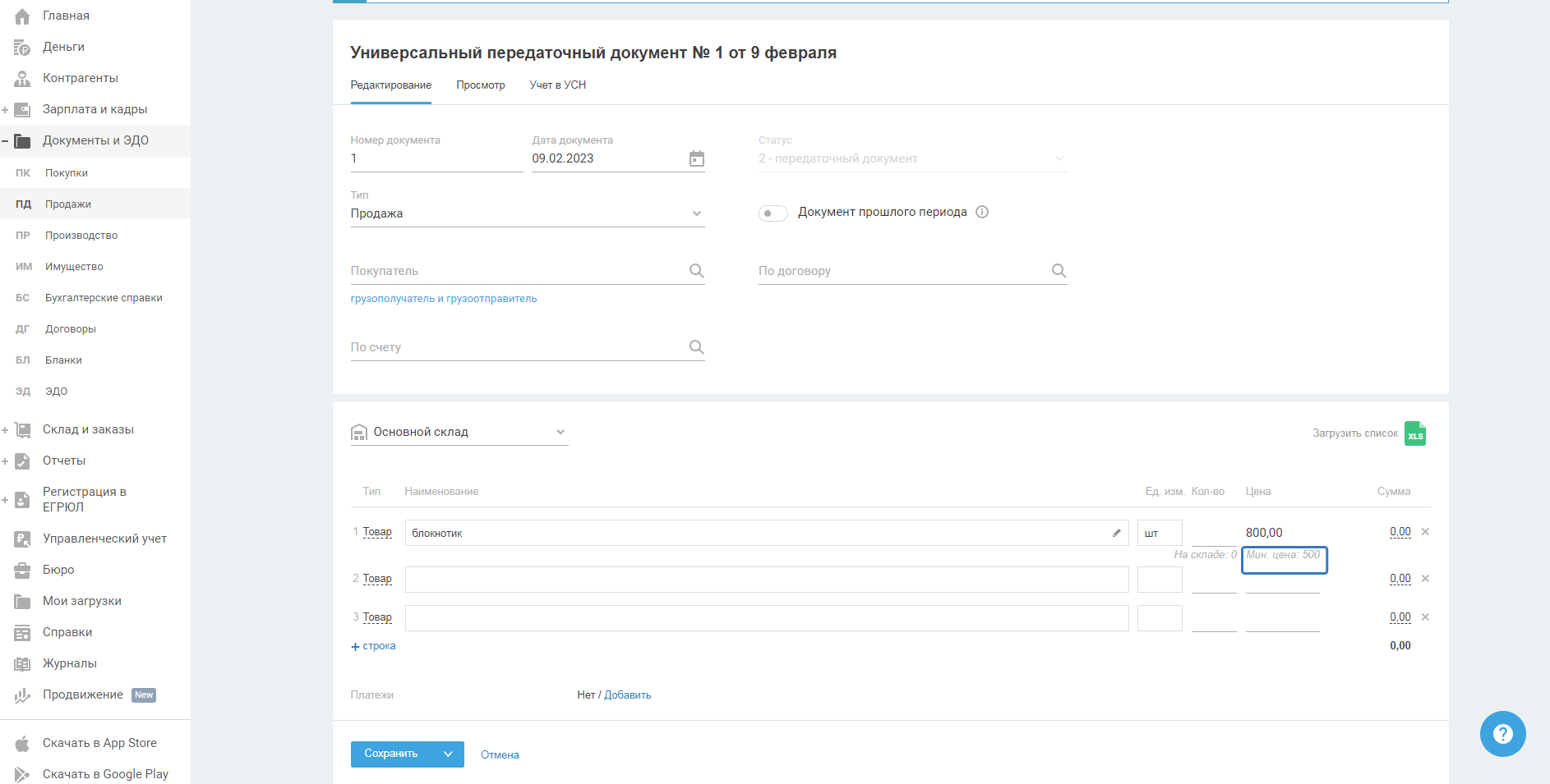 При создании и редактировании документов на продажу таких как: счёт на оплату(счёт-договор); накладная на продажу(накладная на возврат); УПД на продажу - после заполнения поля "Цена без НСД" или "Цена с НДС" (если в строке "НДС" указано "в т.ч."), под графой "Сумма" отображается подсказка с указанием минимальной цены за данный товар.