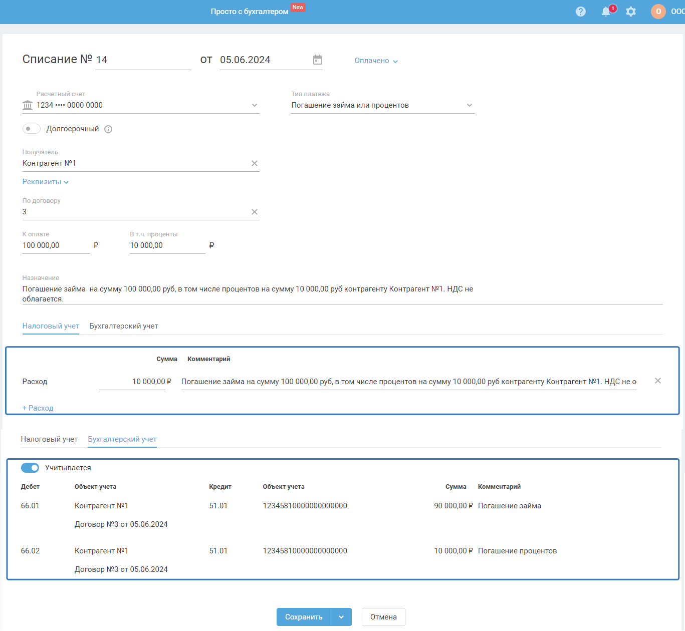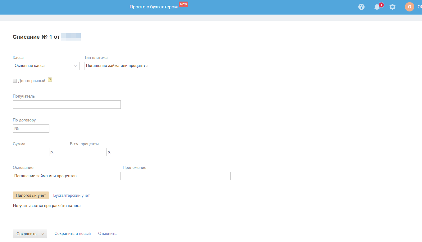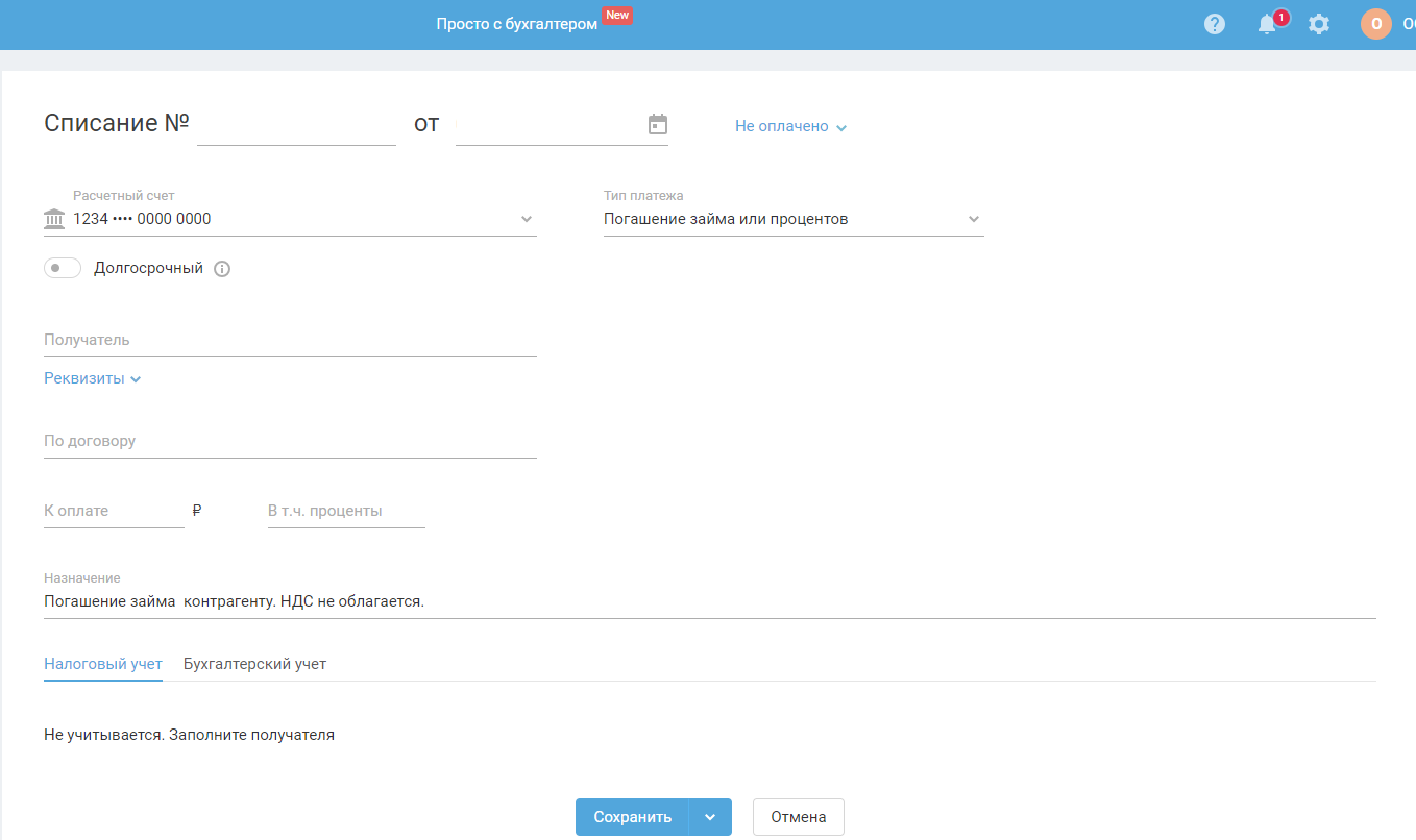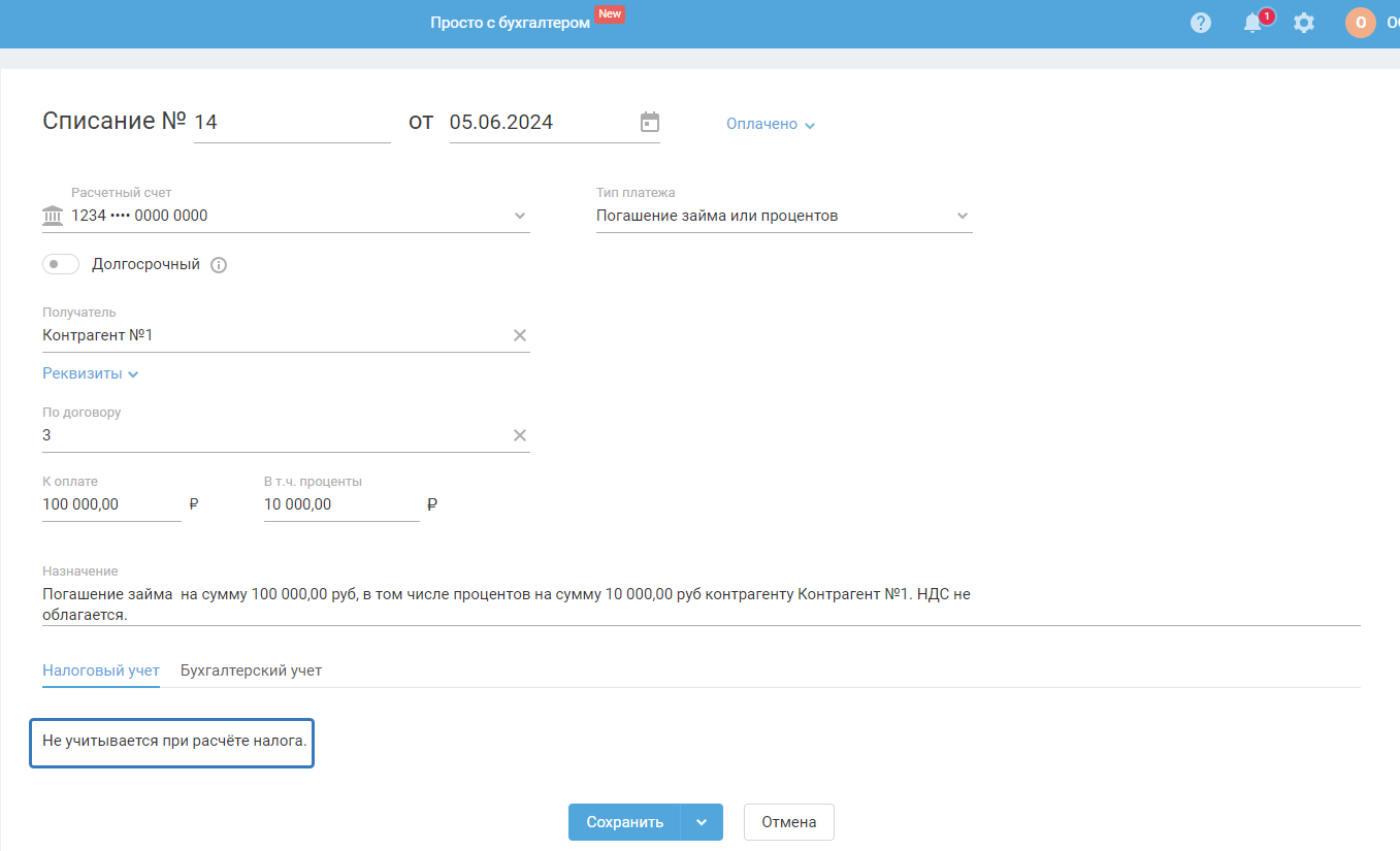 Если был получен займ, то при его возврате (с процентами или без) используется тип списания «Погашение займа/кредита или процентов».