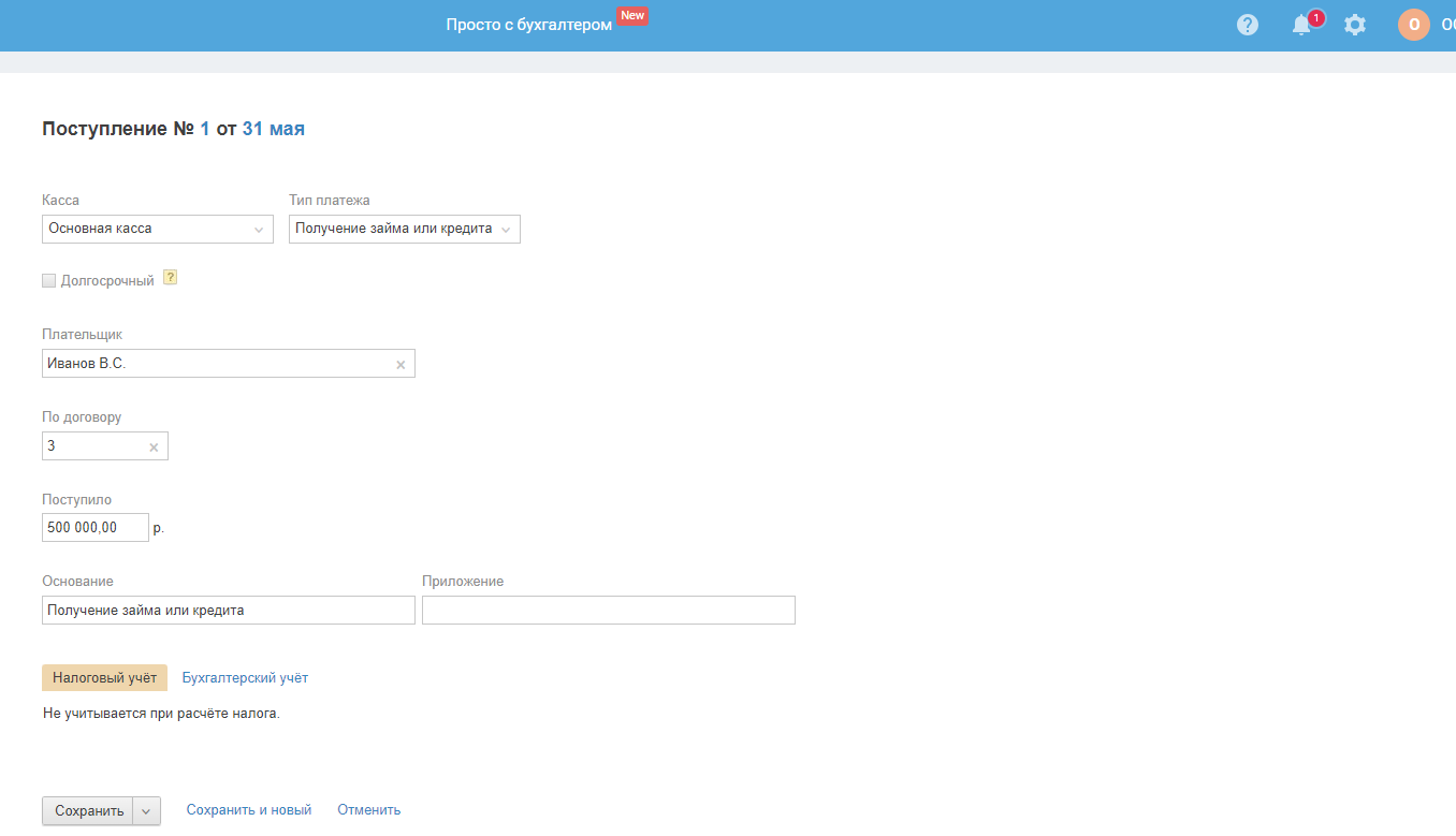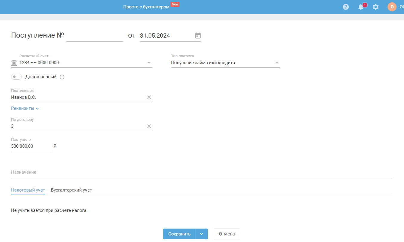 - В поле «Основание» — отразите произвольное описание, например, «Беспроцентный займ учредителя ФИО на сумму ...» или «Получен займ от ... на сумму ...». При необходимости вы можете отредактировать данный текст на свое усмотрение.