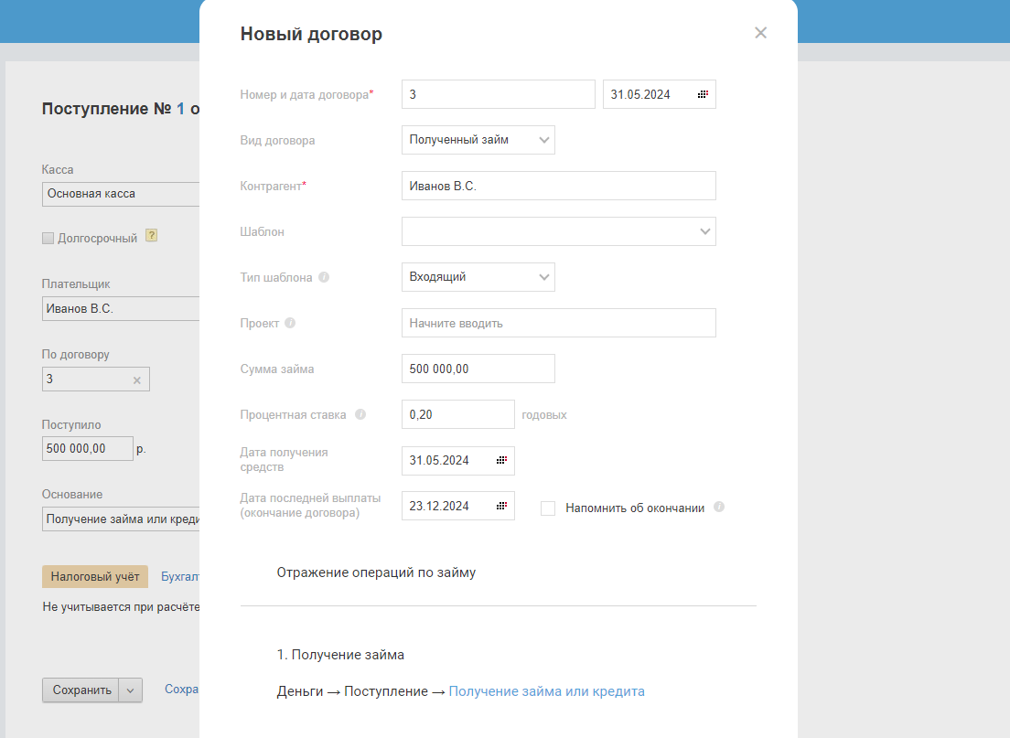 - В графе «Объекта учёта» — выберите контрагента (учредителя), от кого получен займ и договор.