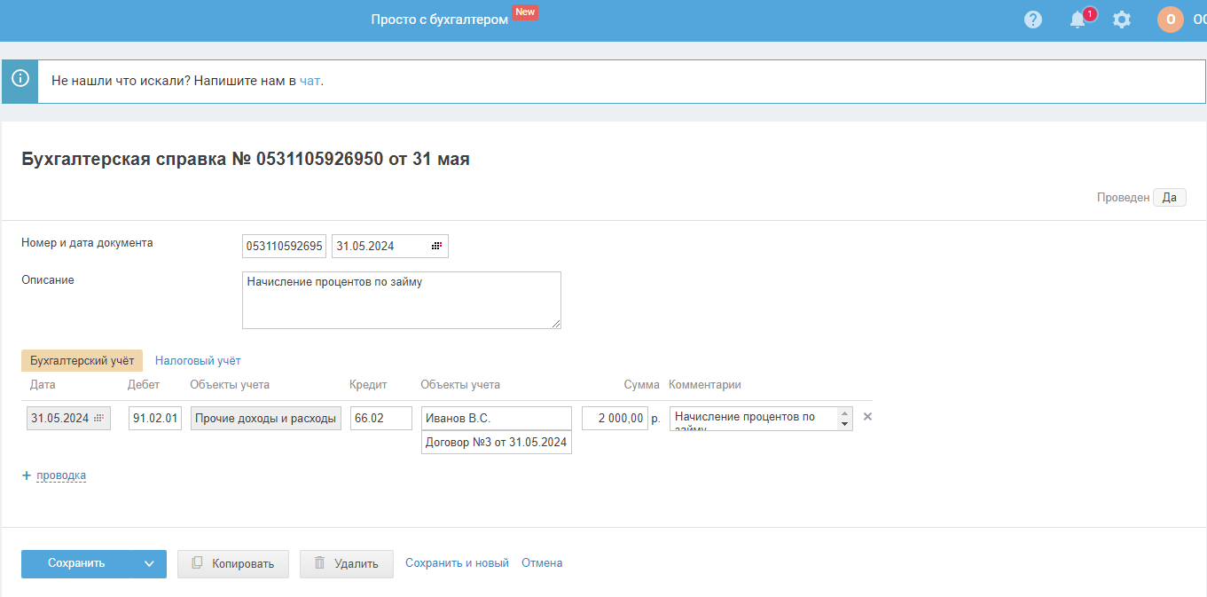 При добавлении договора укажите сумму процентов (если она есть), дату, с которой они начисляются и когда заканчиваются. Это позволит сервису автоматически создавать бух. справку на начисленные проценты во вкладке «Документы и ЭДО».