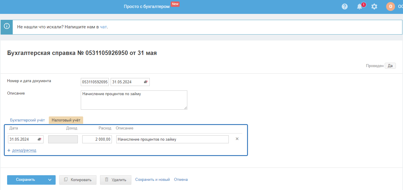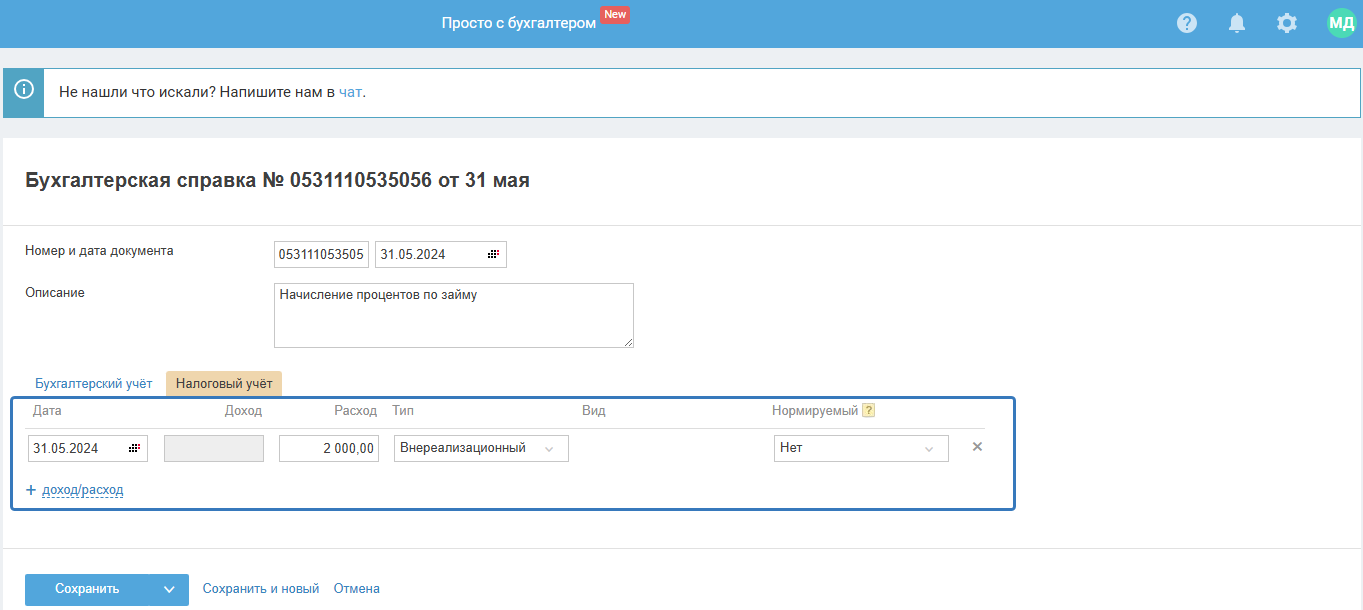 - В графе «Дата» — отразите дату учёта процентов в расходах для налогового учёта.