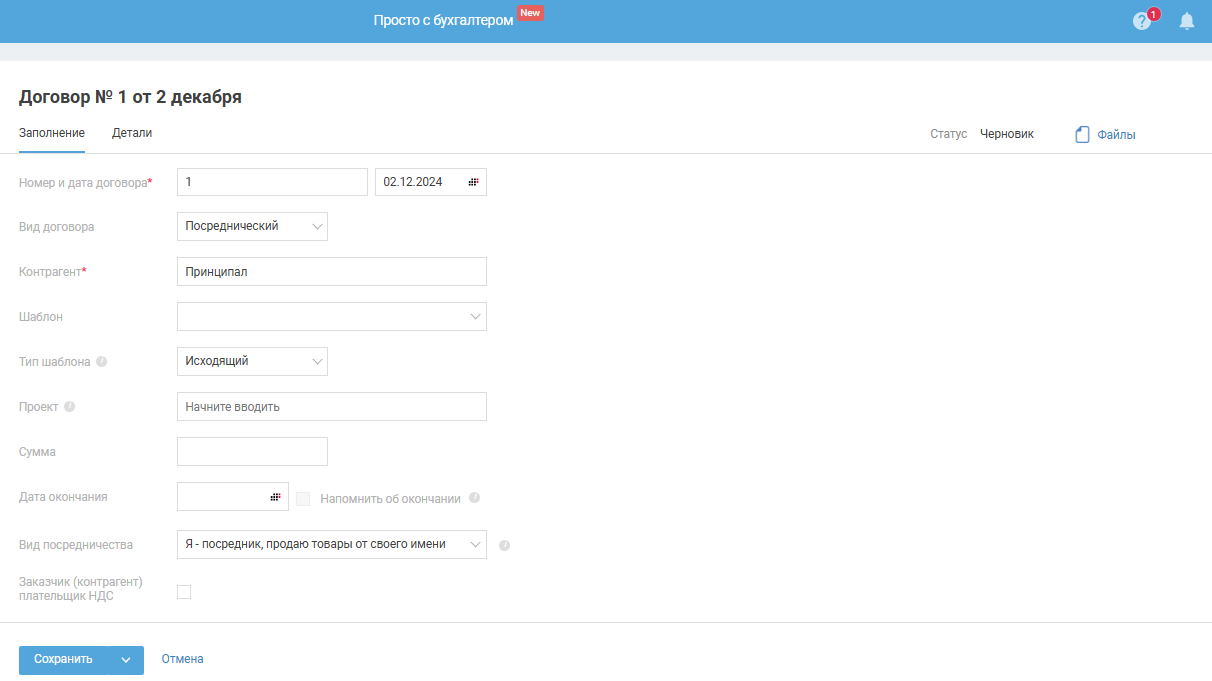 Создайте договор с принципалом (комитентом) в разделе «Документы и ЭДО — Договоры»: