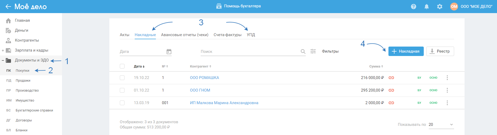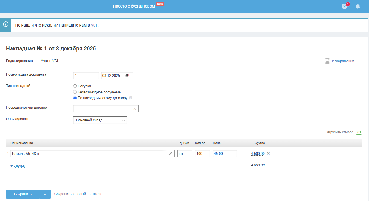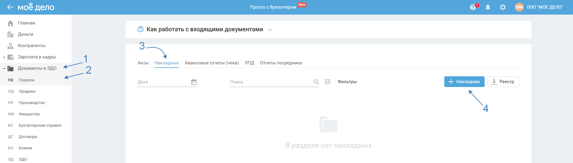 Отразите поступление товара от принципала (комитента) в разделе «Документы и ЭДО — Покупки — Накладная/УПД», добавив накладную или УПД на покупку: