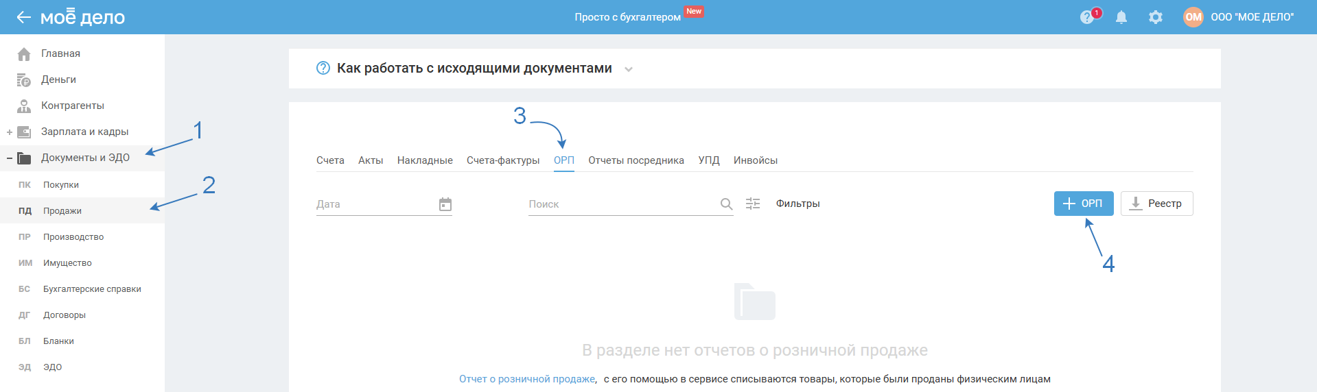Факт выбытия товара (передачи его покупателю), при продаже его в розницу, оформляется с помощью отчёта о розничной продаже в разделе «Документы и ЭДО — Продажи»: