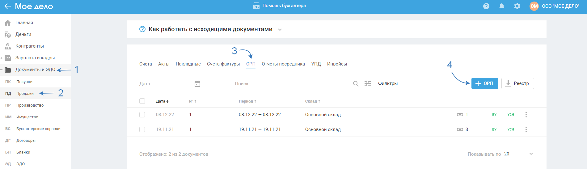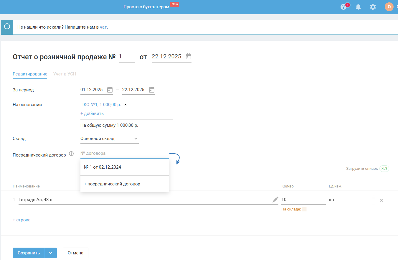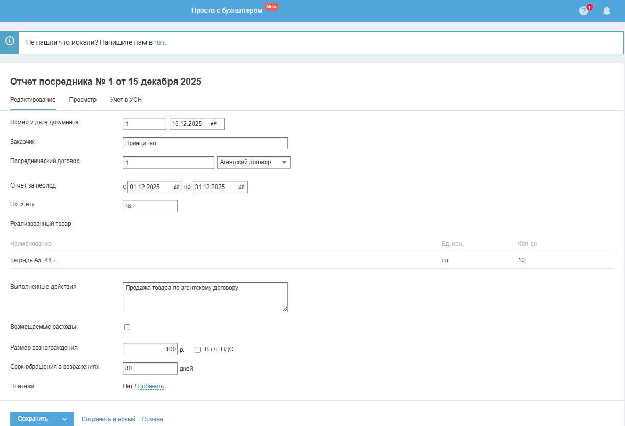 Создайте отчёт посредника (агента, комиссионера) в разделе «Документы и ЭДО — Продажи — Отчёты посредника»: