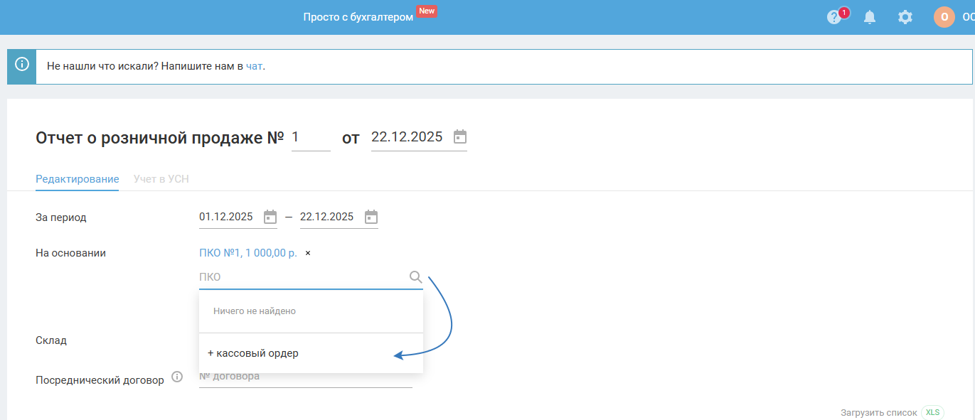 - для создания поступления с типом «Розничная выручка по посредническому договору» используйте опцию «+ кассовый ордер» строки «На основании» из формы отчёта о розничной продаже: