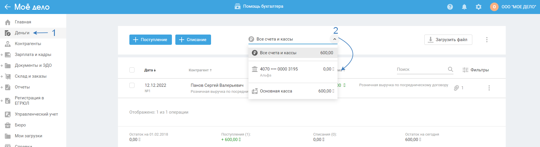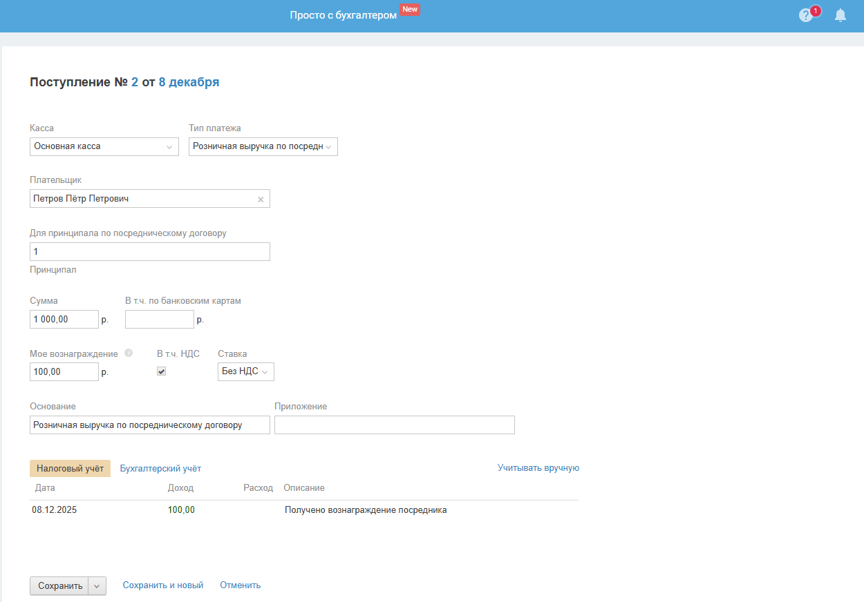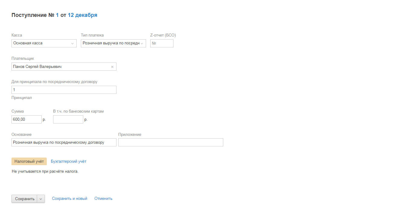 - для отражение полученной розничной выручки от клиентов создайте поступление в разделе «Деньги» с типом платежа «Розничная выручка по посредническому договору»: