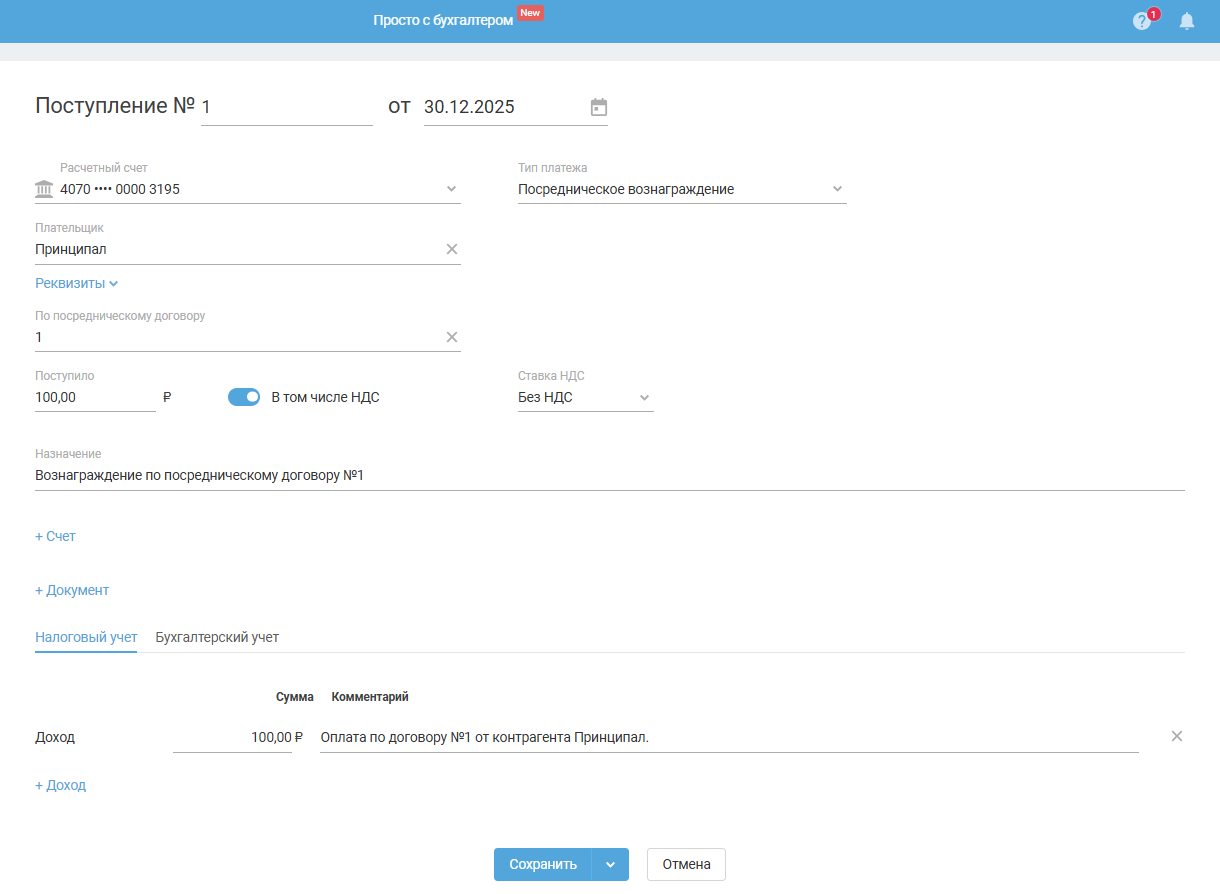 2) В дальнейшем принципал (комитент) переведёт вам денежные средства отдельным платежом. Для их отражения создайте в разделе «Деньги» поступление с типом «Посредническое вознаграждение»: