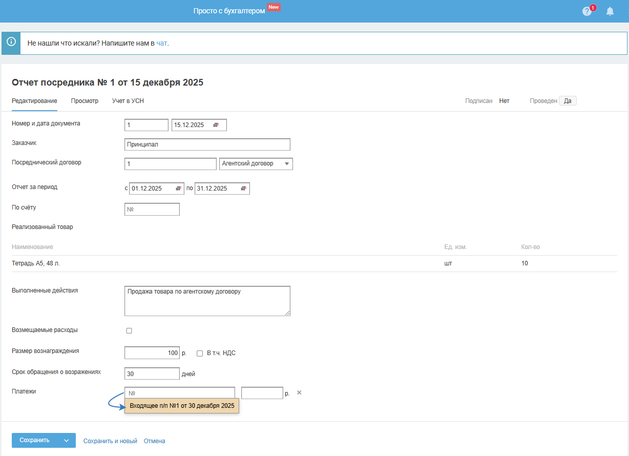Привяжите полученное от принципала (комитента) посредническое вознаграждение к отчёту посредника. Для этого в форме отчёта посредника в строке «Платежи» выберите из выпадающего списка или начните печатать его номер поступления из раздела «Деньги» с типом посредническое вознаграждение: