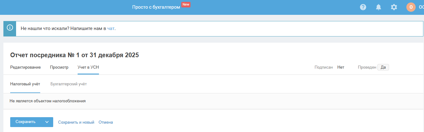 После сохранения отчёта посредника, перейдите во вкладку «Учёт», в блоке «Налоговый учёт» отображаются данные для расчёта налога: